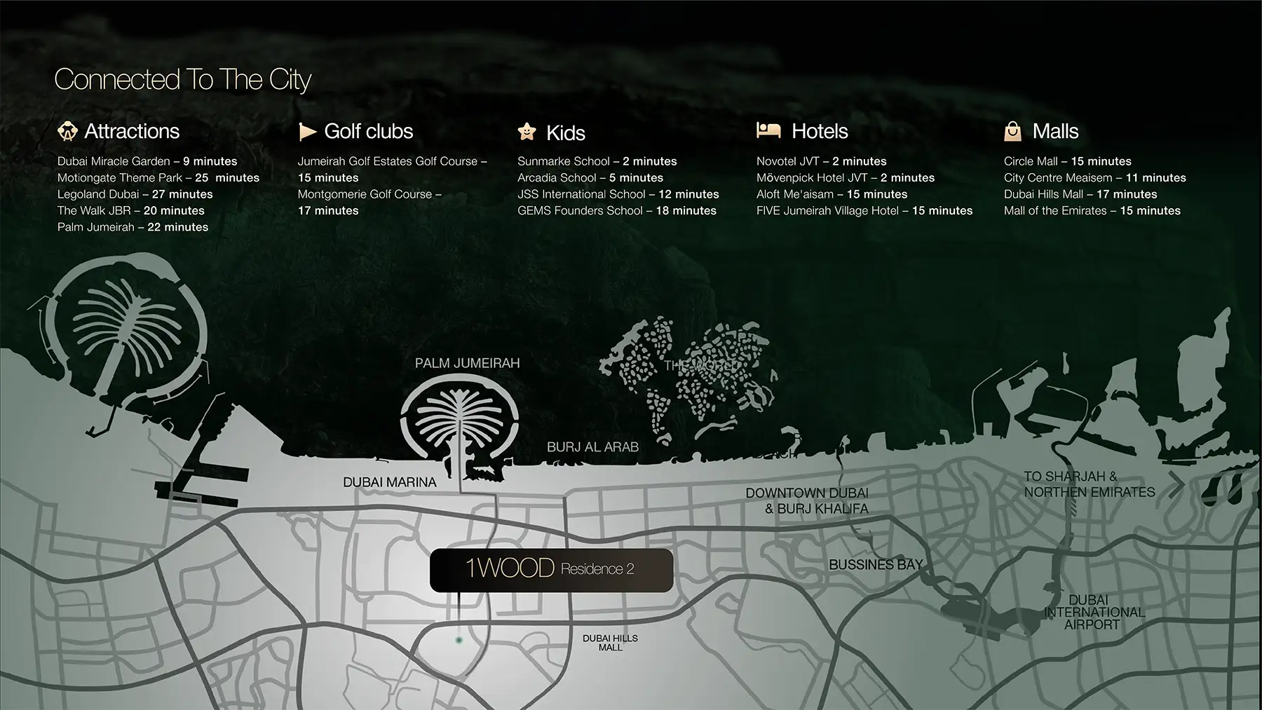 Welcome to 1Wood Residence 2 A feel of luxury, space and nature With a Prime location in JVC DUBAI. Strategically located away from the hustle of the city, the community has an easy access to the city’s main roads, Al-Khali Road and Sheikh Mohammed Bin Zayed Road connecting it to the familiar landmarks such as Dubai Marina Walk, Palm Jumeirah, Burj Al Arab, Sports City, Motor City and Jumeirah Golf Estates. This ideal location also helps ensure convenience with all the lifestyle conveniences such as schools, health facilities, shopping centres and a variety of cafes and restaurants, and hotels being just a few minutes’ drive away.