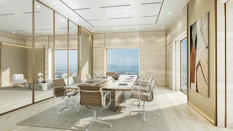 The interior is made of high-quality materials, such as natural wood or marble, and gives the feeling of luxury, comfort and professionalism. The design promotes productivity and inspiration through carefully designed layouts and a plethora of natural light, boosting work potential and well-being. All working areas blend functionality with style, making these the perfect environments for vibrant businesses.