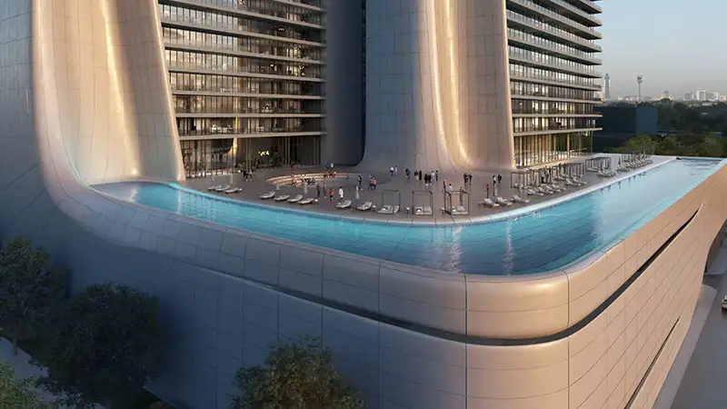 This development has vision that marks the debut of an innovative wellness-centric concept precision wellness setting a new standard in luxury living. Designed with meticulous care, both towers feature ultra-luxury residences and offer high-end services tailored to each unit. The façade reflects a sophisticated fusion of biophilic design, advanced technology, and architectural artistry. Natural stone and polished metal finishes look increases a refined sense of materiality, creating an immersive, health-conscious environment.