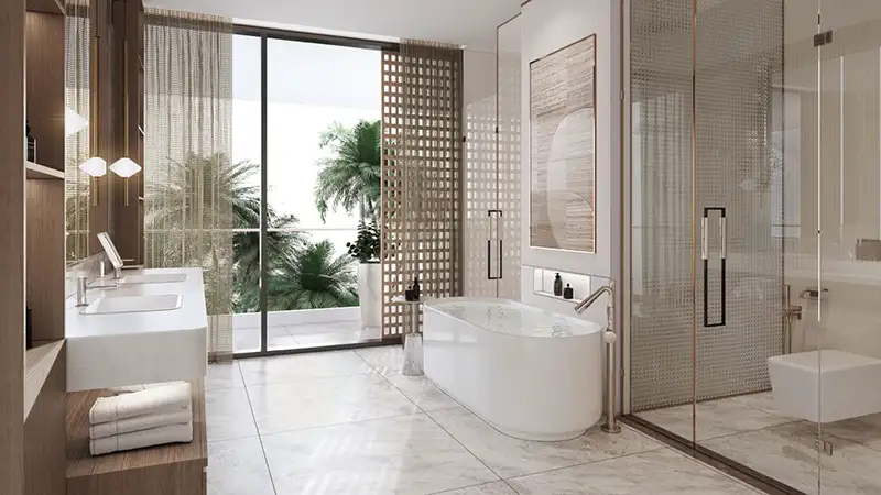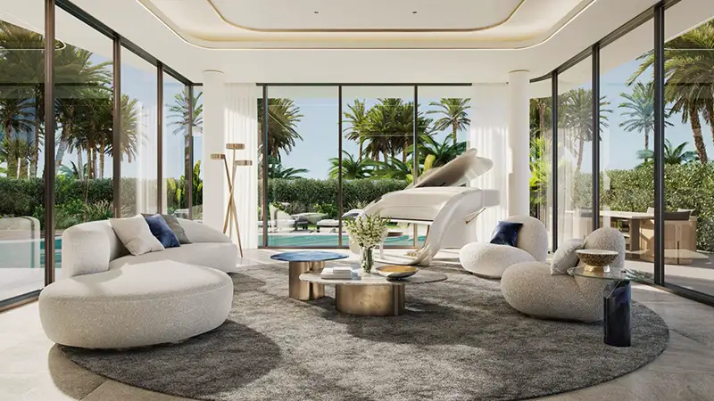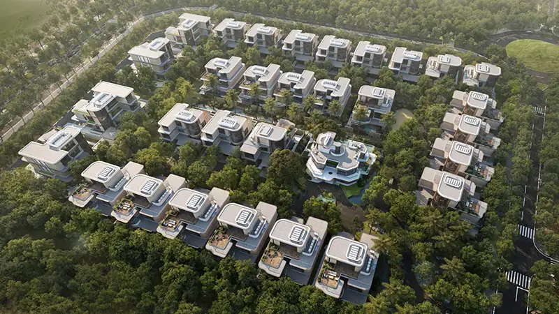 Choices of 4, 5, or 6-bedroom layouts mean every lifestyle fits perfectly in this development. Design elements in the five-bedroom villas come with cantilevered terraces and expansive poolside façades. Inside, four-meter-high ceilings create an impressive feeling of space, harmonized with a neutral color palette and rich finishes adding a touch of refined elegance. The use of high-quality materials and innovative technology guarantees that every room will meet aesthetic expectations and provide functional, comfortable living.