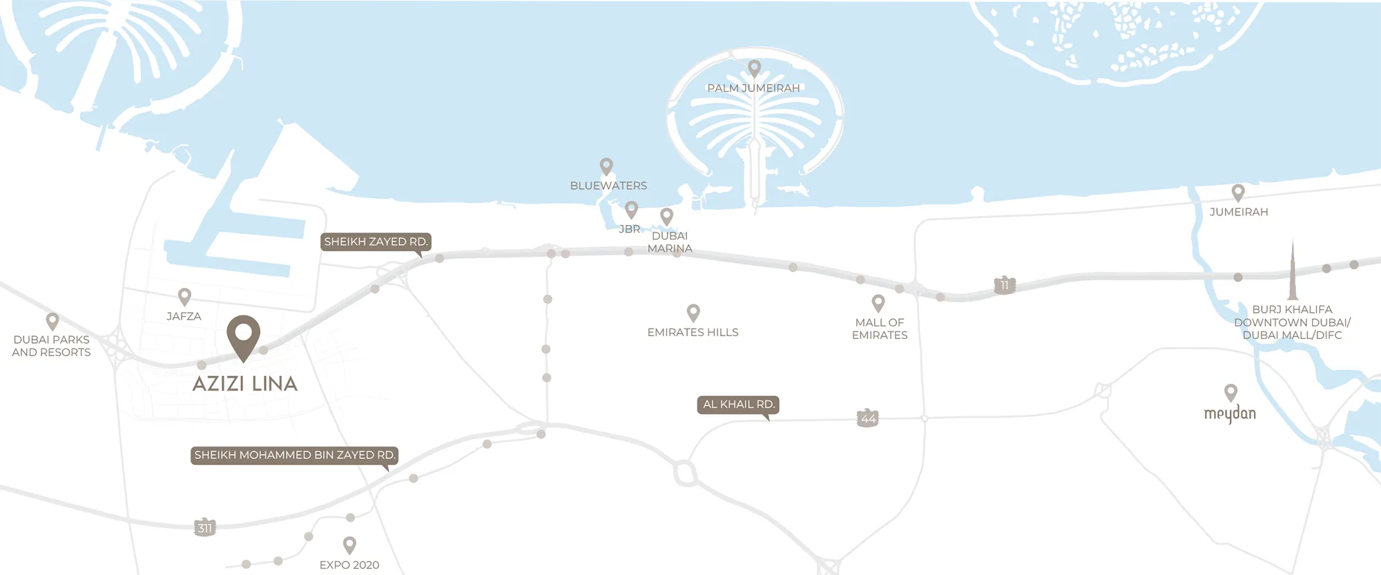 Azizi Lina is a well-planned and established location in Jebel Ali, Dubai which offers a perfect mix of industrial, commercial and residential significance. It hosts the Jebel Ali Port, which is one of the world's major ports and a thriving Free Zone (JAFZA) that has become a place for multinationals such as Dell. The residents also benefit from a mixed life style with the provision of parks, entertainment destinations and even community centres in close proximity and it is undoubted that this connectivity via Sheikh Zayed Road/Dubai Metro makes for convenient commutes to prevalent attractive locations of the city. Close to major business districts, shopping centres and tourist attractions, this inherent vitality turns Jebel Ali into one of the most popular places to live and invest in Dubai.