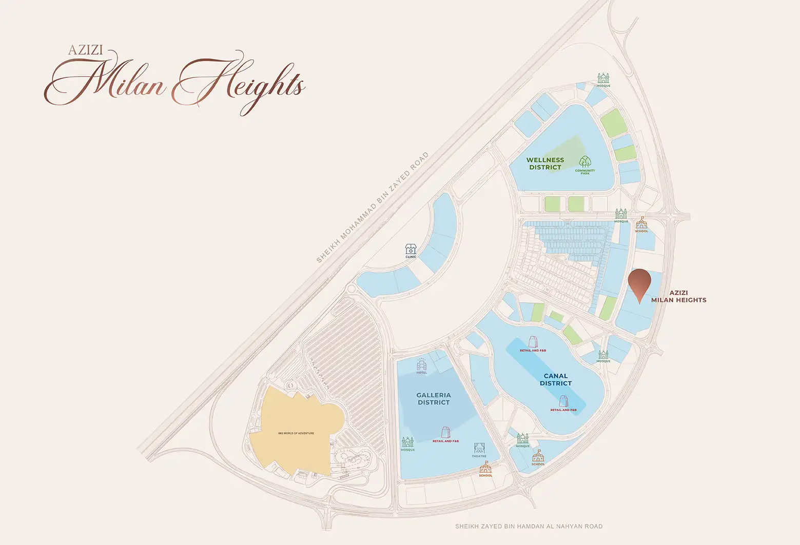 Azizi Milan Heights by Azizi Developments is envisioned with the same signature quality and cutting-edge approach as other global cities throughout the world, that’s what makes it one-of-a-kind. Committed to sustainability and thoughtful development, the stretching high-rise towers are grounded by verdant landscapes, open space and pedestrian-friendly walkways that allow for connectivity and peace.