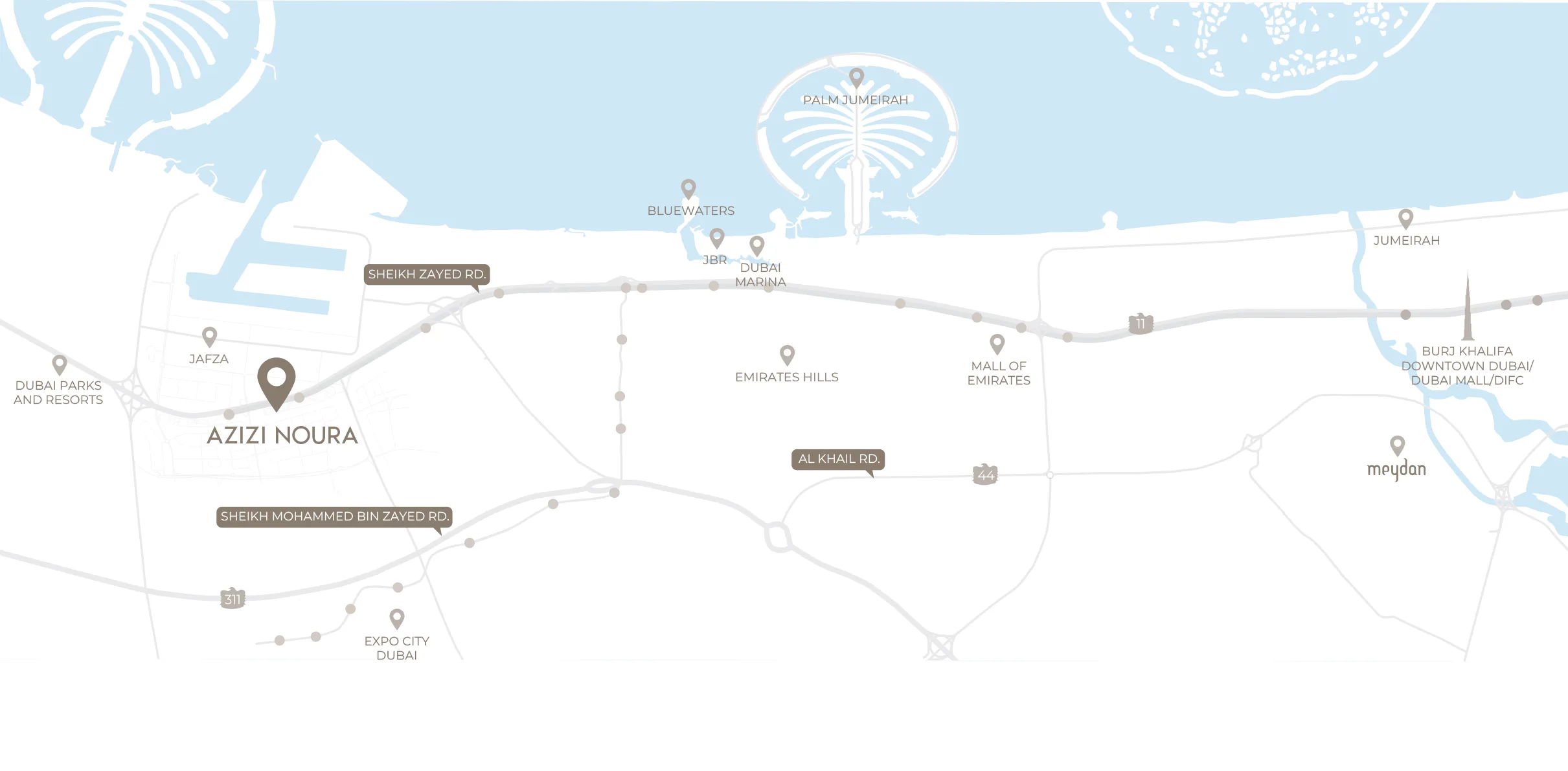 Azizi Noura sits comfortably in the heart of Jebel Ali, Dubai and benefits from a fabulous location. Strategically located close to Sheikh Zayed Road, the project provides quick access to important destinations including Dubai Marina, Downtown Dubai, Expo City and Dubai South. It is served well by primary services such as good schools, hospitals, shopping centres and recreation destinations it contains amenities suitable for families and professionals alike. Amidst the rapidly growing infrastructure and community-based life style of this development is an impeccable connected residence that truly settles urban living with non-polluted residential environment.