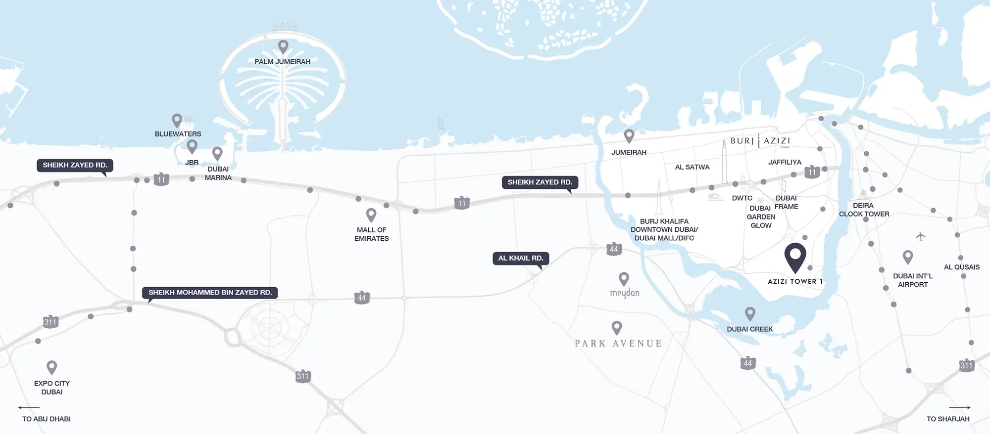 Azizi Tower 1 is a branded commercial tower situated at Al Jaddaf, providing tenants with a prestigious address and proximity to the best of what Dubai has to offer in terms of transportation and vibrant environment. With easy entry and exit points to Al Khail Road and Creek Metro Station, there is convenient access from important parts of the city such as Za’abeel 1, Dubai Design District, Burj Khalifa and Business Bay and The Jumeirah coastline. Only a few minutes’ drive from Dubai International Airport (DXB) you can take advantage of the easy route for global travellers. Positioned amid residential areas, cultural and entertainment centres, it is an ideal location in Dubai's ever growing commercial sector.