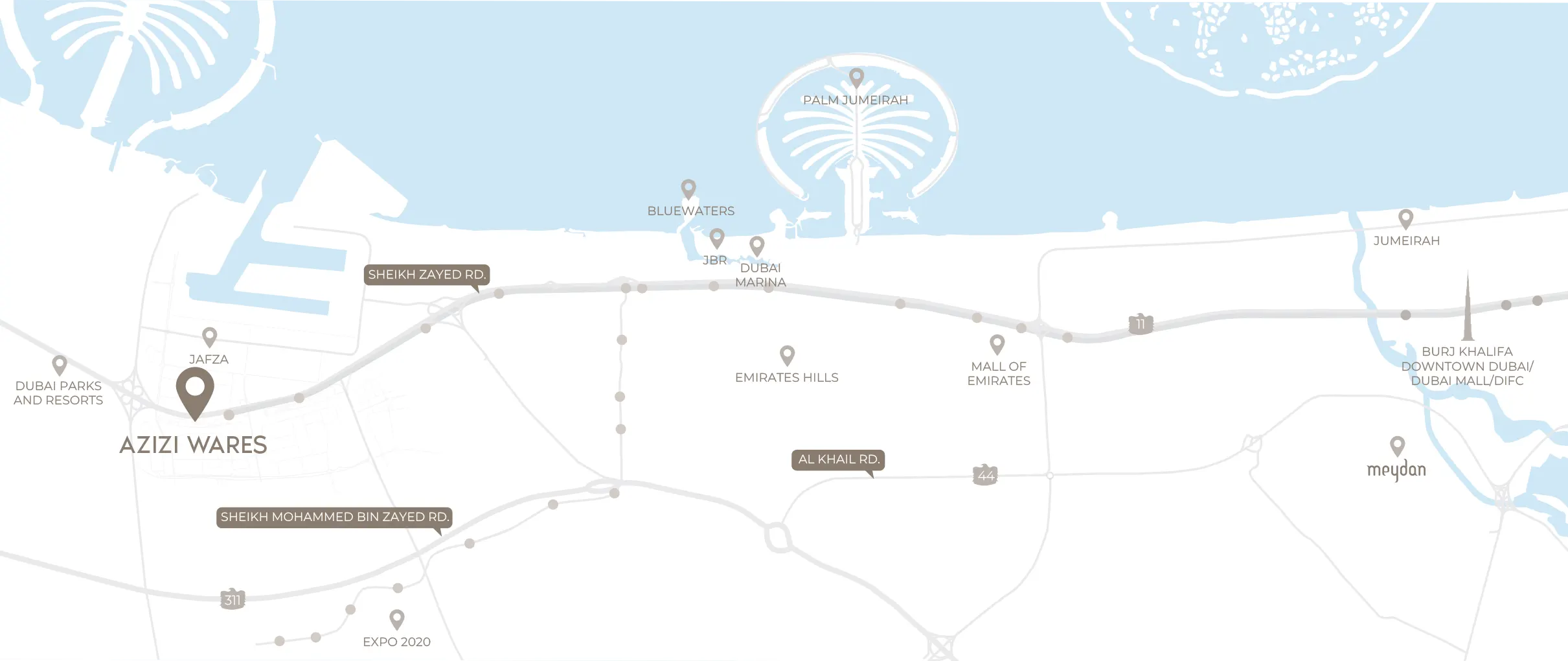 AZIZI Wares Located in Downtown Jebel Ali, enjoys one of the most enviable locations in the city. That offers residents unparalleled connectivity and the benefits of living in the heart of Dubai. Being in close proximity to major highways, metro stations, as well as key business districts, this Developments connects the residents to the most famous addresses of Dubai such as Dubai Marina, Expo City Dubai, and Al Maktoum International Airport. The area is both bustling and calm, which is ideal for professionals and families. With numerous options for shopping, dining, and entertainment, it offers just the perfect mix between convenience, accessibility, and an urban lifestyle that Developments offers in the one of Dubai’s most well-connected communities.