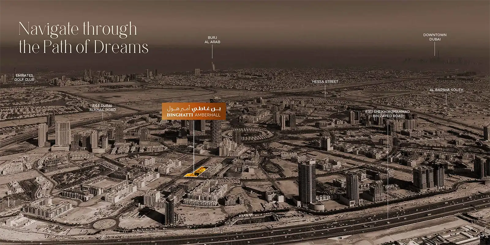 Binghatti Amberhall at Jumeirah Village Circle (JVC) is evidence to living in Dubai. Its prime location ensures quick access to major highways, making Downtown Dubai, Dubai Marina, and Dubai International Airport easily reachable. The community is well-equipped with shopping centers, restaurants, and spots, all within walking distance. Shops, restaurants, facilities are all within walking distance, providing everyday convenience. The community has well-planned infrastructure and nearness to major highways make travelling to the most significant landmarks and business hubs. The development ensures a high standard of living with proximity to retail centers, fine dining establishments, and leisure facilities. The development is a perfect place to call it home due to its accessibility and peacefulness. It offers a luxurious lifestyle with breathtaking views and easy path to all the main points of interest. A stroll through the community boutique shops, fine dining restaurants, and leisure destinations, all within easy reach.