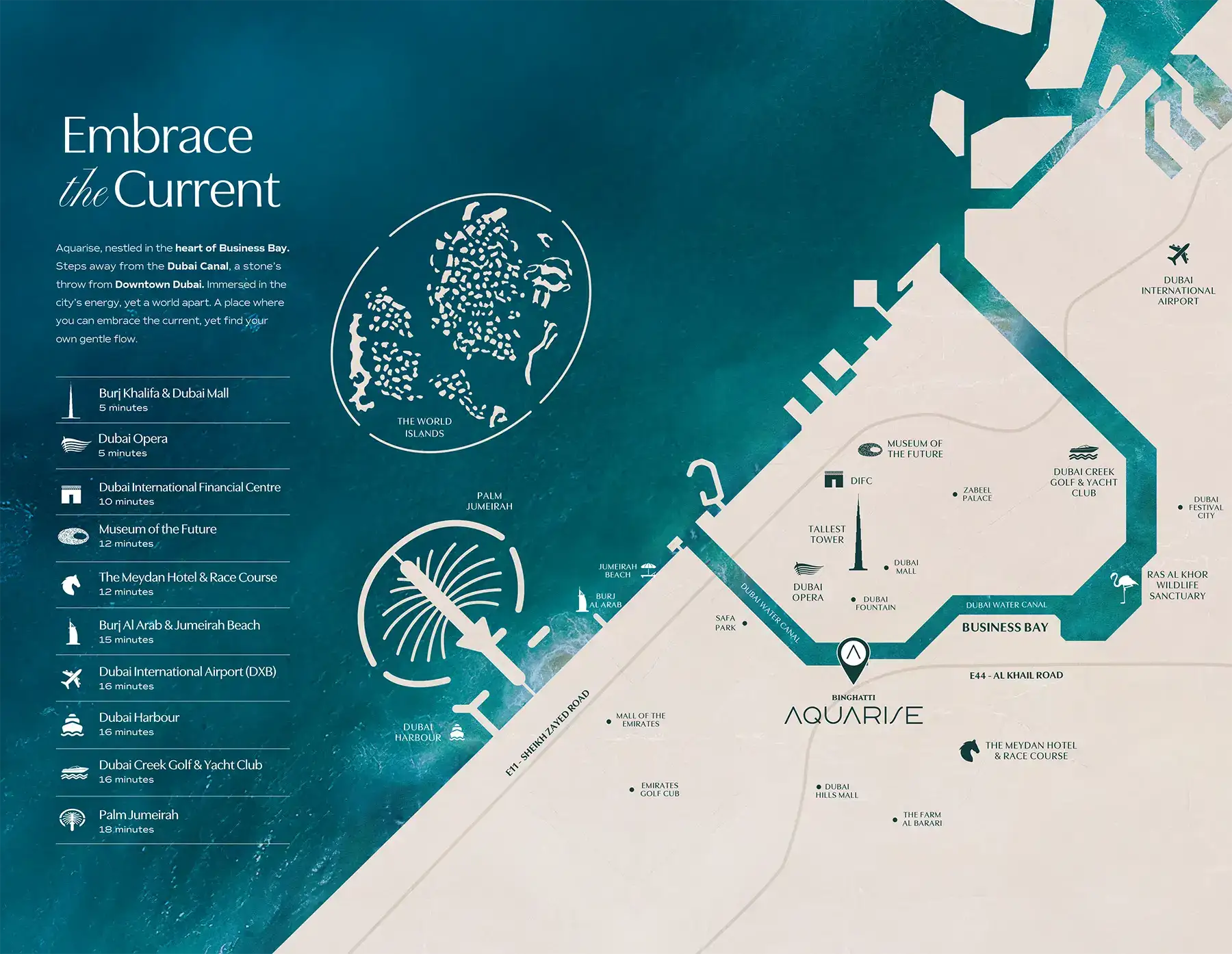 Located in Business Bay, Binghatti Aquarise provides you in a world of prestige moments from Dubai’s iconic destinations and elite lifestyle hubs. Situated in a prestigious waterfront location, the development offers residents immediate and effortless access to the vibrant urban core of Dubai. There is a direct connectivity to famous landmarks such as the Burj Khalifa, Dubai Mall, and the broader Downtown district. Residents are perfectly located to enjoy both the convenience and prestige of living at the heart of the city. Various amenities like leisure, fine dining, high-end retail, or cultural experiences, this prime address ensures everything. Thanks to its strategic positioning near Dubai’s major highways Sheikh Zayed Road and Al Khail Road and immediate access to the Business Bay Metro Station, life flows effortlessly, connecting work, play, and everything in between with ease and style.