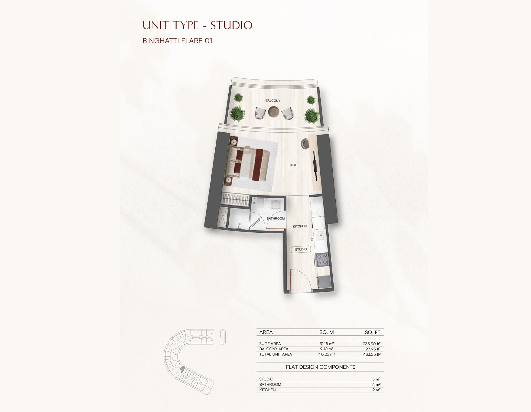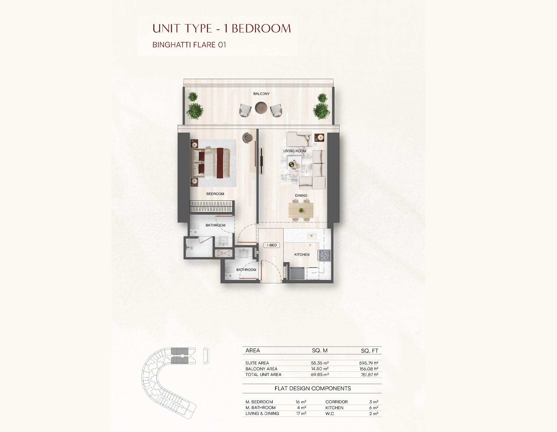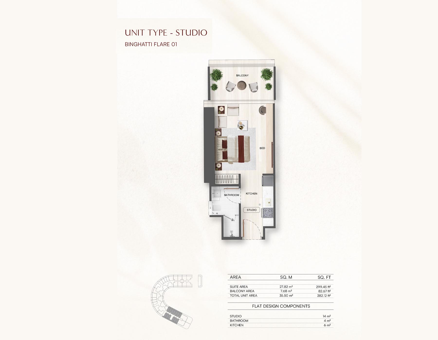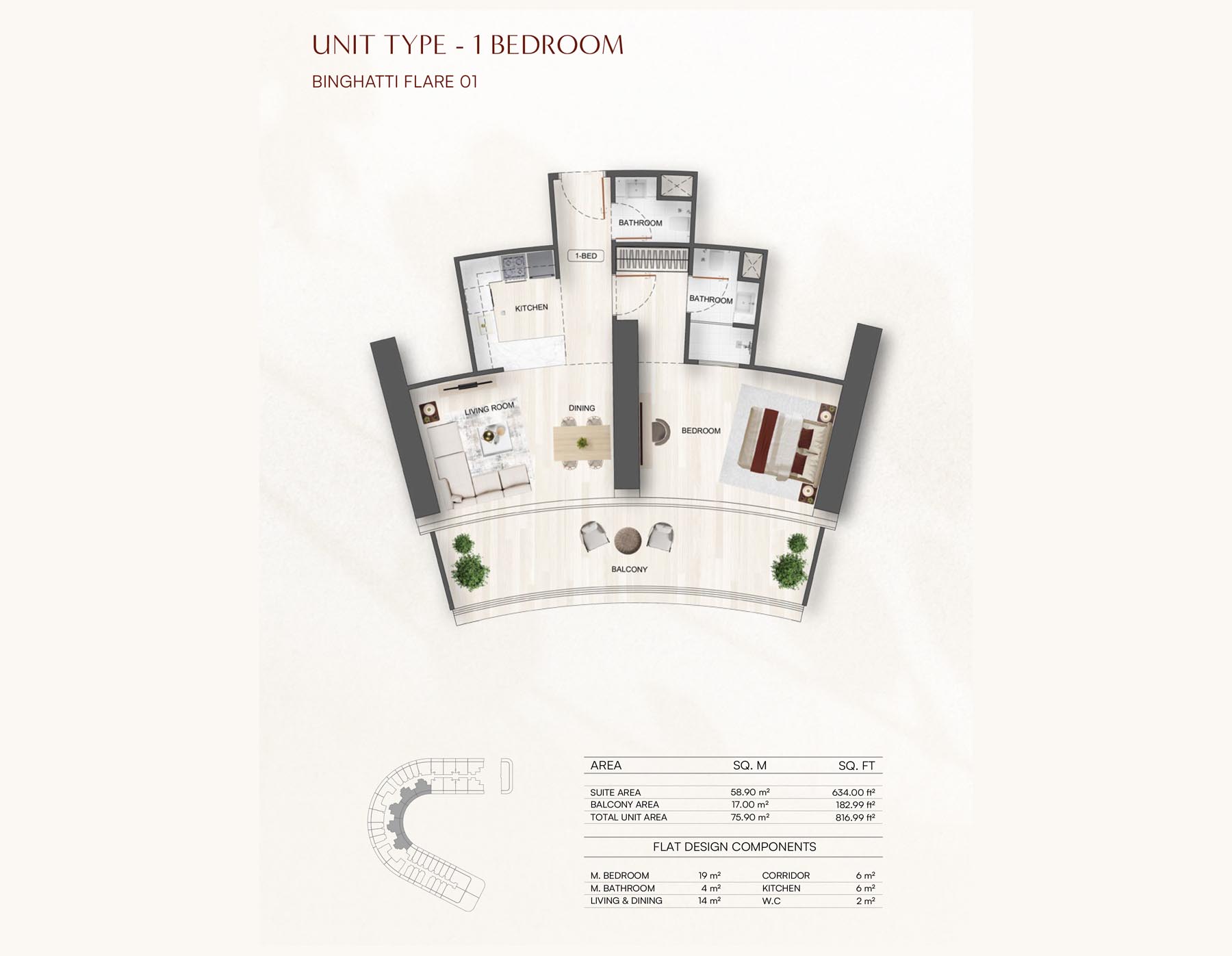 We proudly unveil the floor plans for units, meticulously designed to meet the refined tastes and needs of residents, nestled within Binghatti Flare at JVT. Experience the height of modern living in this impressive twin-tower development, featuring premium, state-of-the-art interiors and layouts. Each unit is designed to capture a spacious, serene, and dynamic atmosphere, with integrated balconies, stylishly furnished bedrooms, and curated living spaces that make every moment special. These carefully designed layouts are created with large windows and open spaces to allow abundant natural light to flood the interiors, enhancing the sense of openness and tranquility. The thoughtful placement of these openings also offers sweeping views of the surrounding neighborhood, providing residents with an ever-changing panorama of the area’s beauty.