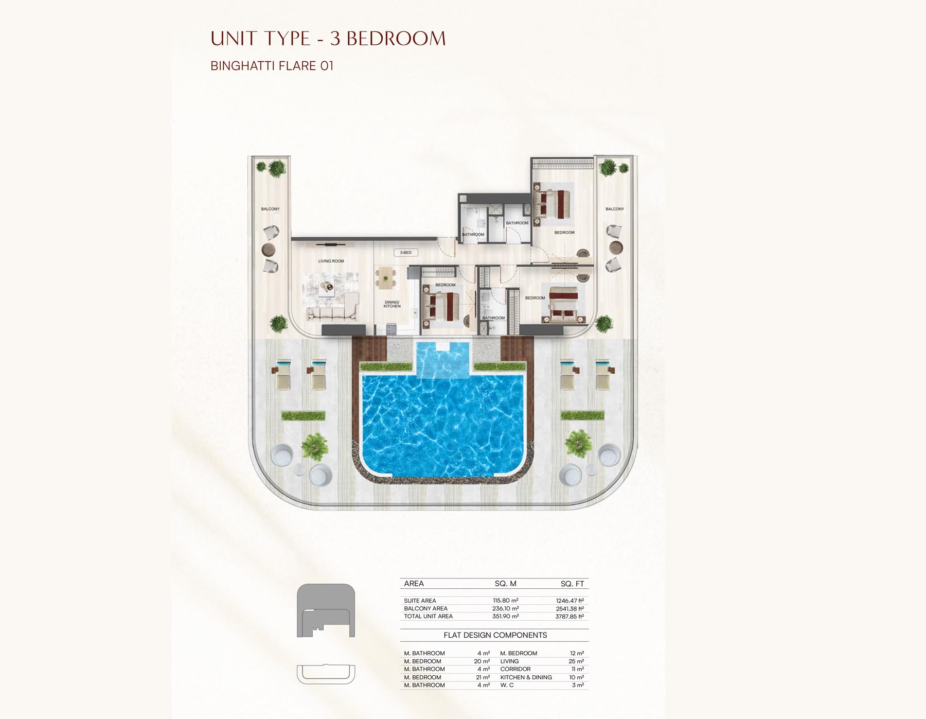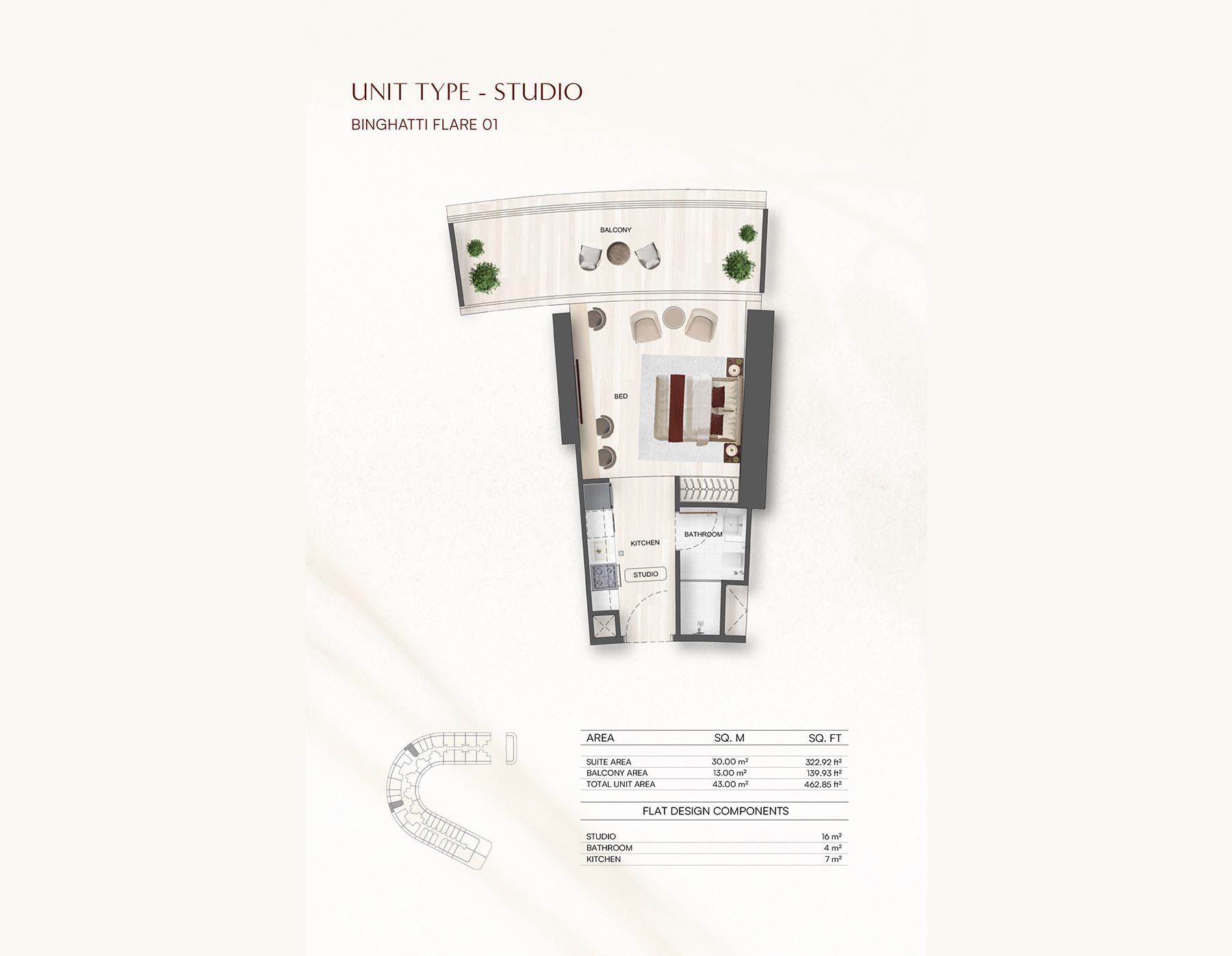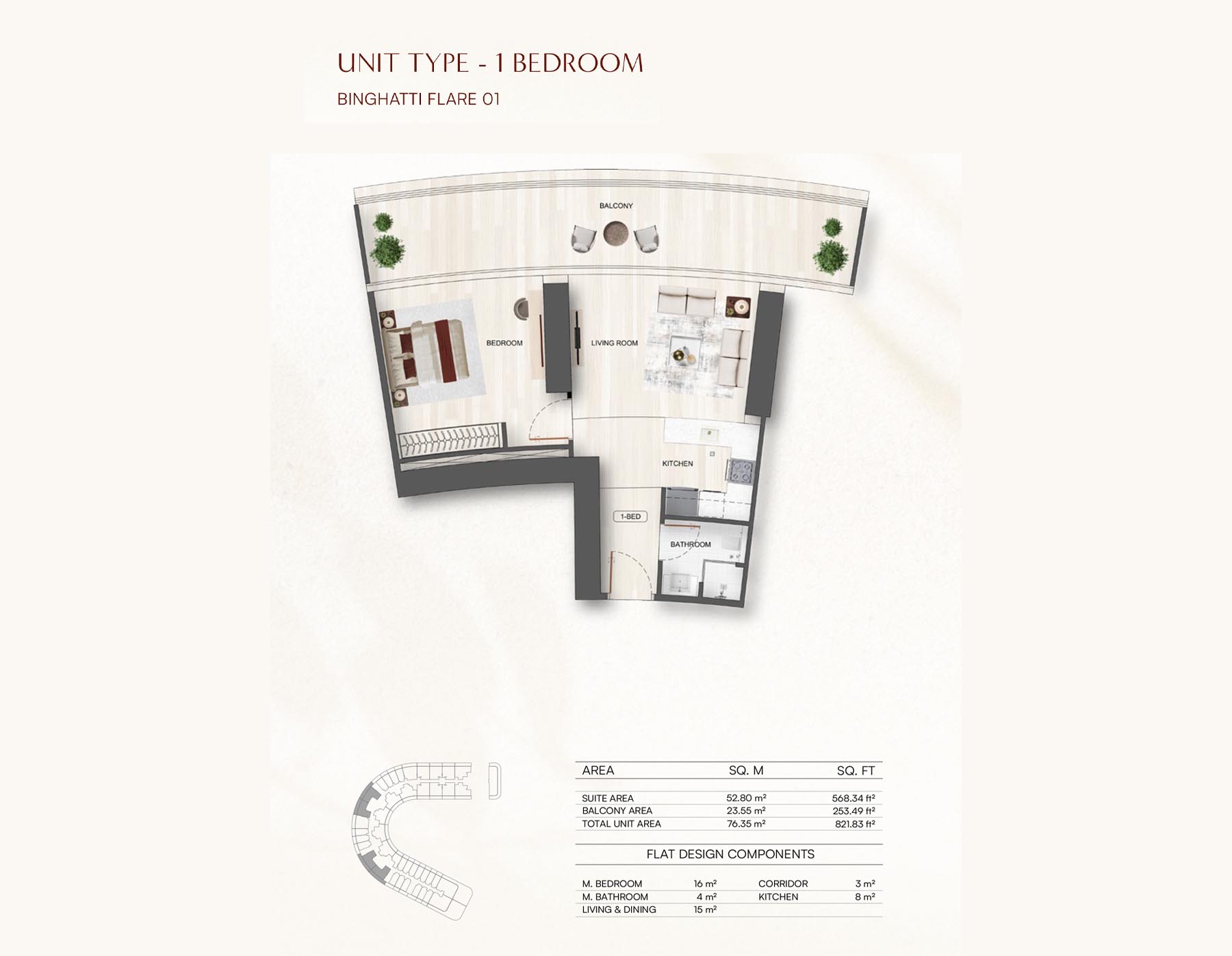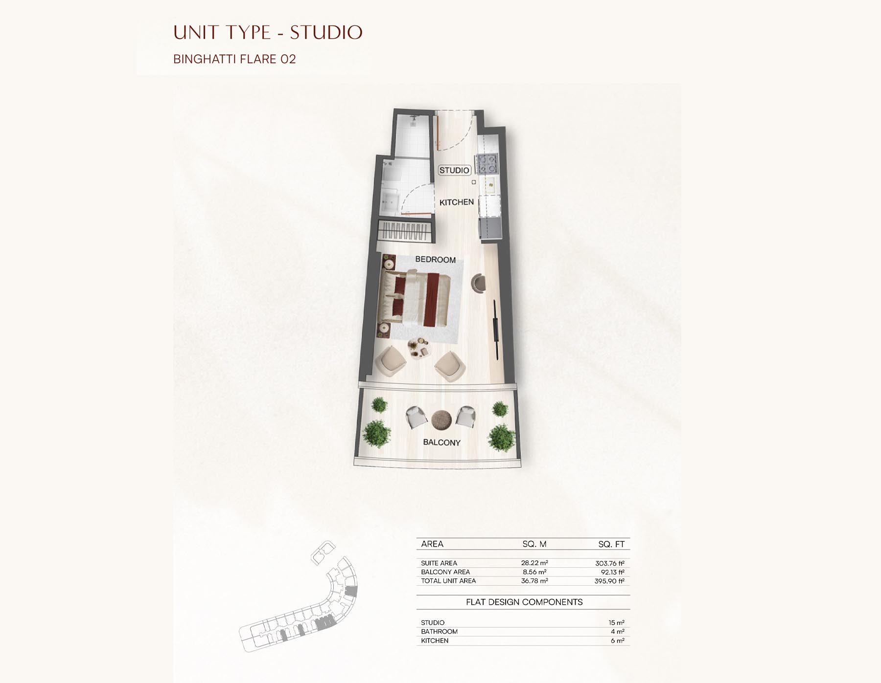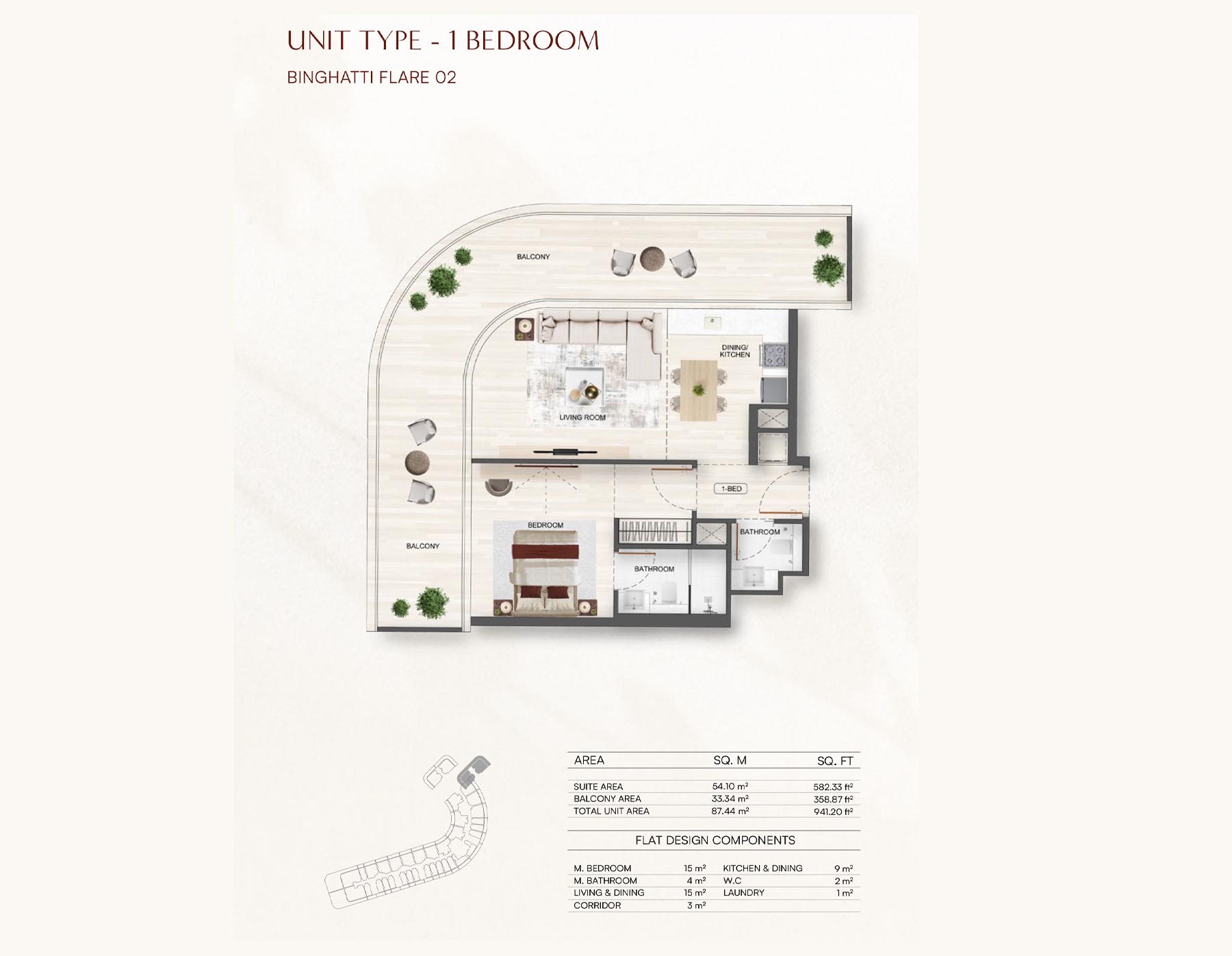 We proudly unveil the floor plans for units, meticulously designed to meet the refined tastes and needs of residents, nestled within Binghatti Flare at JVT. Experience the height of modern living in this impressive twin-tower development, featuring premium, state-of-the-art interiors and layouts. Each unit is designed to capture a spacious, serene, and dynamic atmosphere, with integrated balconies, stylishly furnished bedrooms, and curated living spaces that make every moment special. These carefully designed layouts are created with large windows and open spaces to allow abundant natural light to flood the interiors, enhancing the sense of openness and tranquility. The thoughtful placement of these openings also offers sweeping views of the surrounding neighborhood, providing residents with an ever-changing panorama of the area’s beauty.