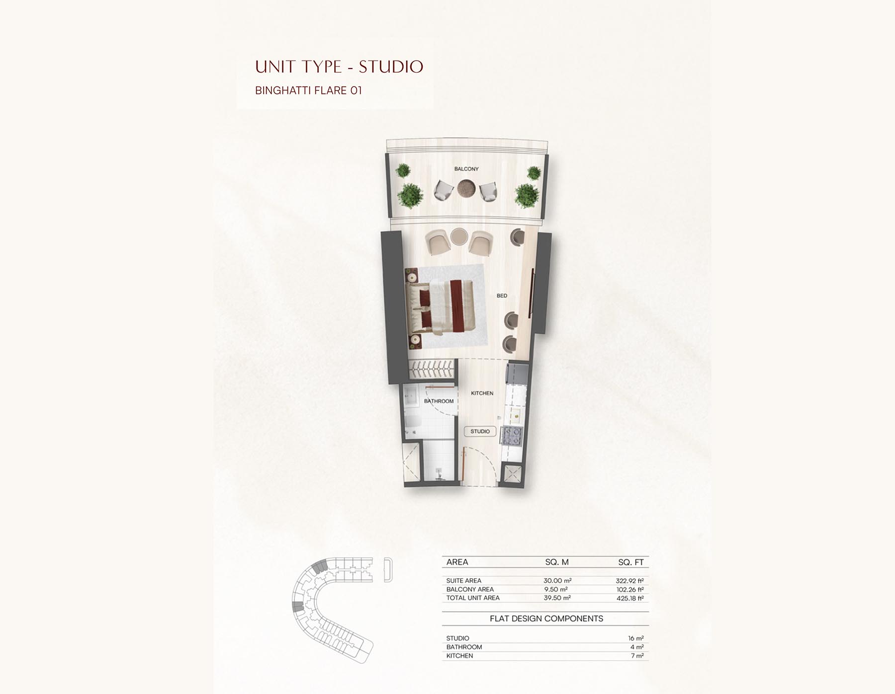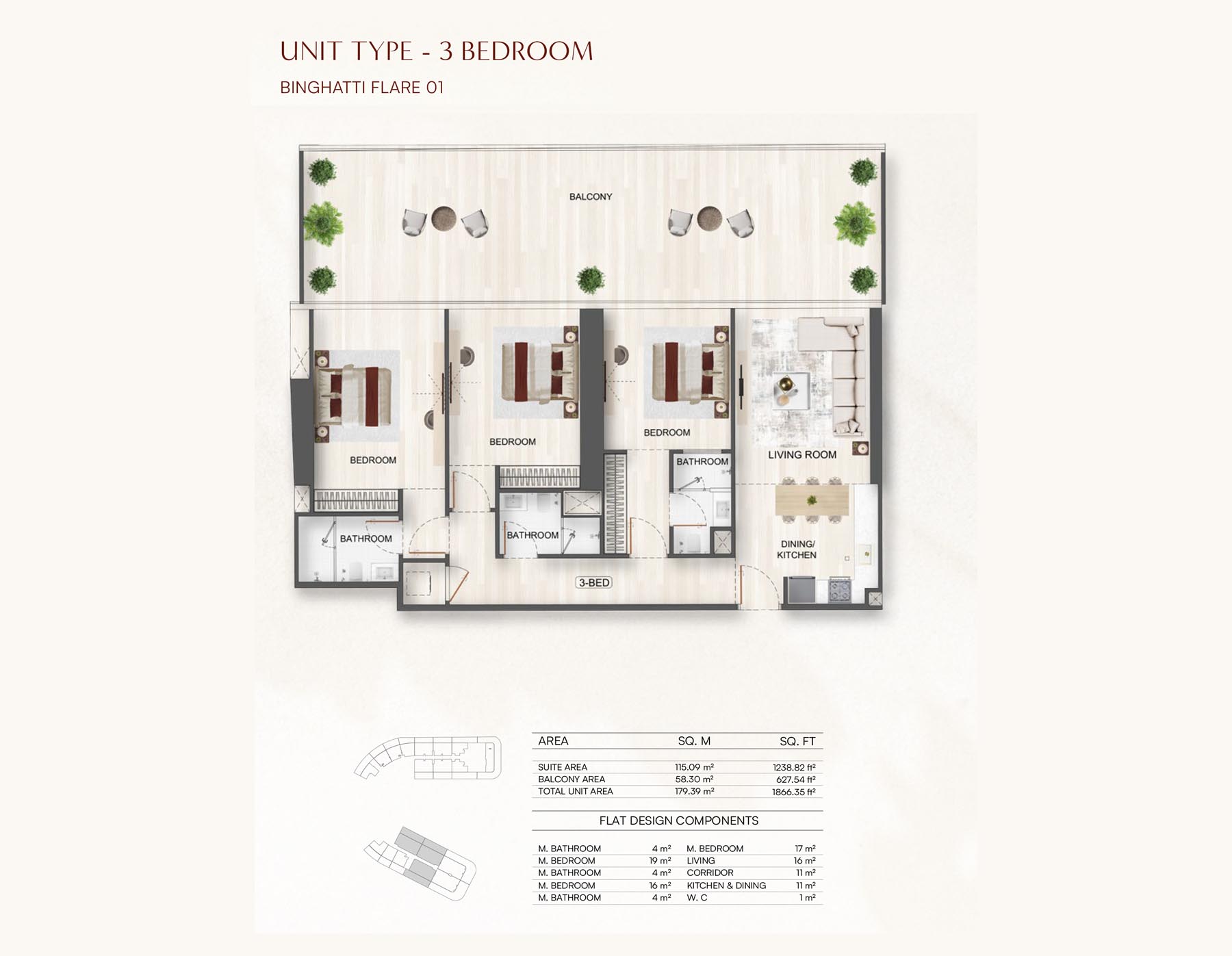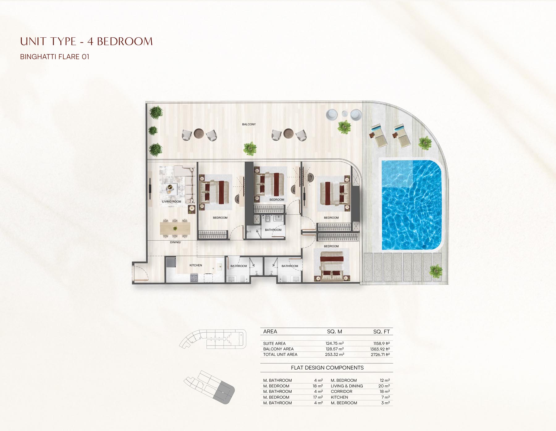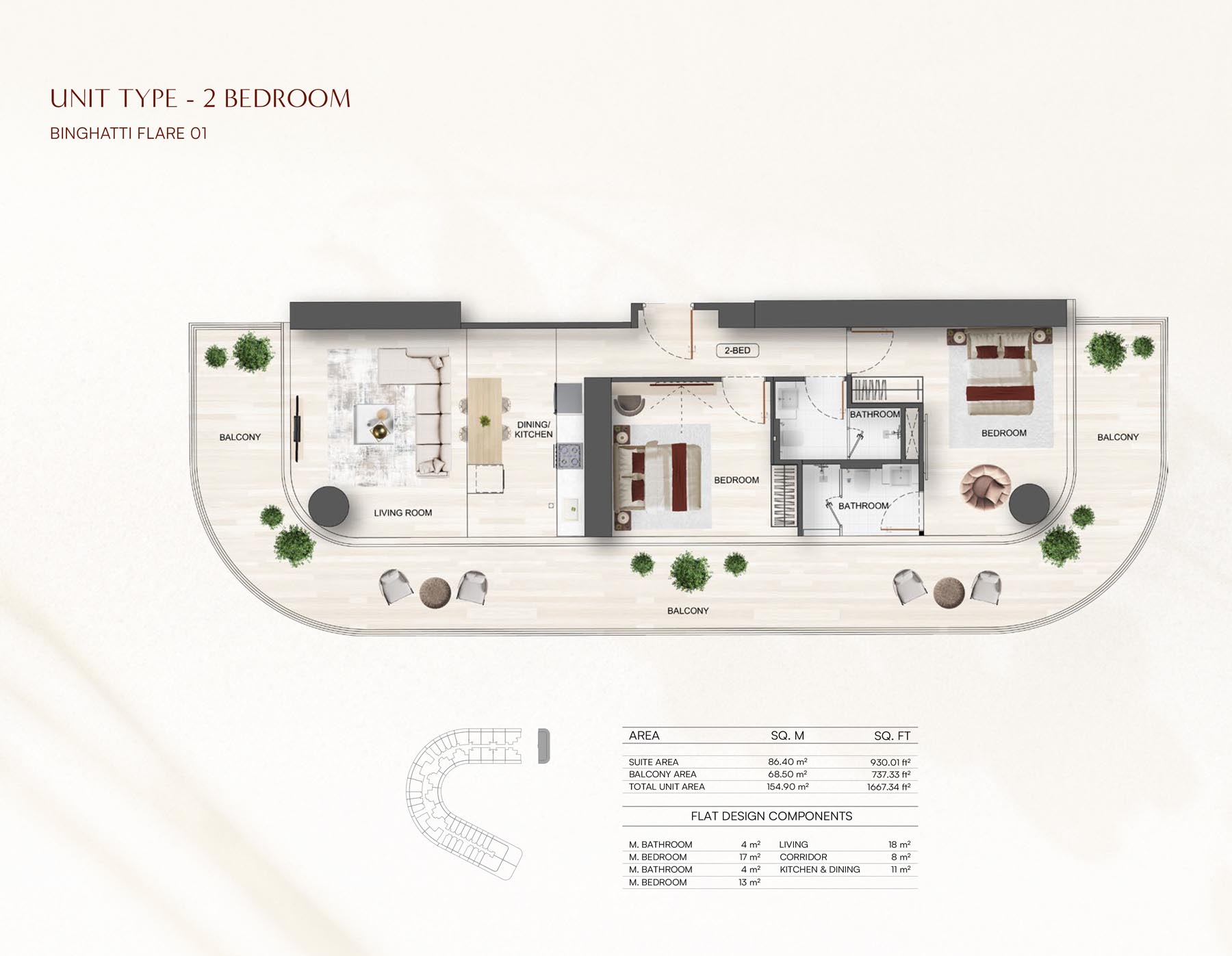 We proudly unveil the floor plans for units, meticulously designed to meet the refined tastes and needs of residents, nestled within Binghatti Flare at JVT. Experience the height of modern living in this impressive twin-tower development, featuring premium, state-of-the-art interiors and layouts. Each unit is designed to capture a spacious, serene, and dynamic atmosphere, with integrated balconies, stylishly furnished bedrooms, and curated living spaces that make every moment special. These carefully designed layouts are created with large windows and open spaces to allow abundant natural light to flood the interiors, enhancing the sense of openness and tranquility. The thoughtful placement of these openings also offers sweeping views of the surrounding neighborhood, providing residents with an ever-changing panorama of the area’s beauty.