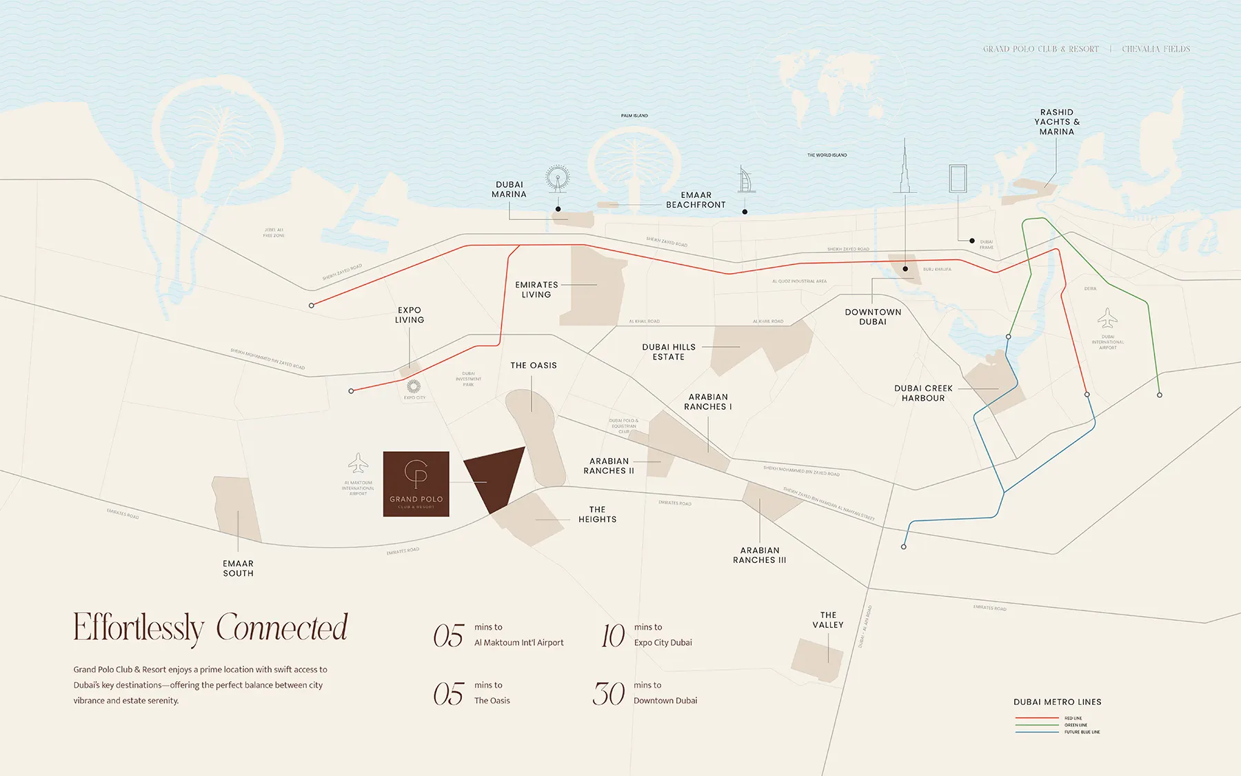 Chevalia Fields within Grand Polo Club & Resort sited at the Dubai Investment Park Second. Offers a desirable location that provides an easy access to Downtown Dubai, Dubai Marina’ and Al Maktoum International airport through the Sheikh Mohammed bin Zayed road, and Emirates Road. This excellent locality is well connected to bustling business areas, high end shopping centres, lifestyle and leisure complexes. Surrounded by new universities, medical facilities, and cultural offerings, families and professionals will appreciate that this refined part of the prestigious Grand Polo Club estate is not only a great location, but a smart one too.