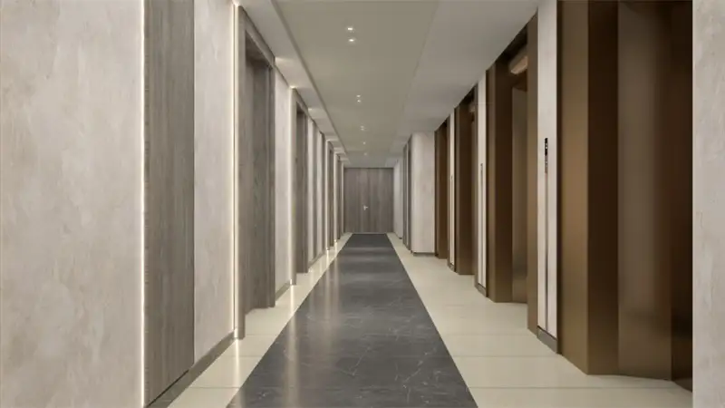 - Beautiful grand entrance lobby, co-working areas, and private wellness amenities such as a steam room and sauna.