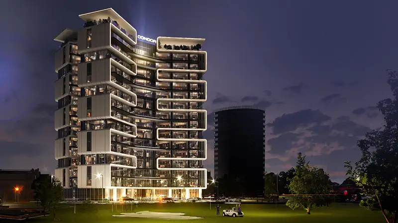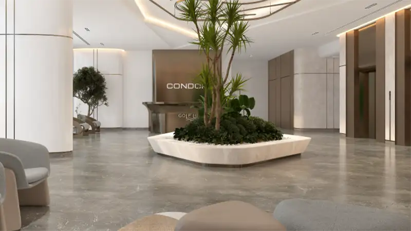 Condor Golf Links 18, or Condor 18, in Dubai Sports City combines modernity with a tranquil golf course setting. Constructed by Condor Developers, this G+5 low-rise residential project offers a portfolio of studios, 1, and 2-bedroom units. Large floor-to-ceiling windows frame green vistas, and the building's sleek lines and earthy warm tones render a sophisticated but welcoming facade.