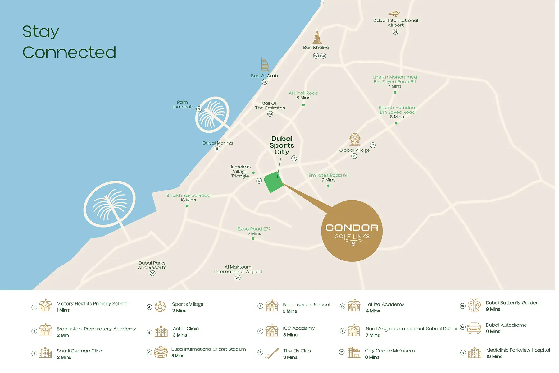 Condor 18 in Dubai Sports City are the smartest among them as this place offers the ideal living condition and easy access to all top-notch destinations with good connectivity. Ideal place for Sports lovers as residents will be within walking distance to the Els Club, Dubai International Stadium, and various other sports academies. They also have easy access to Sheikh Mohammed Bin Zayed Road and Al Khail Road, travelling to destination hotspots such as Dubai Marina, Downtown Dubai and Mall of the Emirates. The community is also located near to Business Bay and easily accessed from both Dubai International Airport and Al Maktoum International Airport. Also, dotted across the neighborhood are various parks with jogging trails and cycling lanes for an active lifestyle. It is also in close proximity to cultural and entertainment hubs, making the location a sought-after address for those who appreciate convenience, recreation and connectivity.
