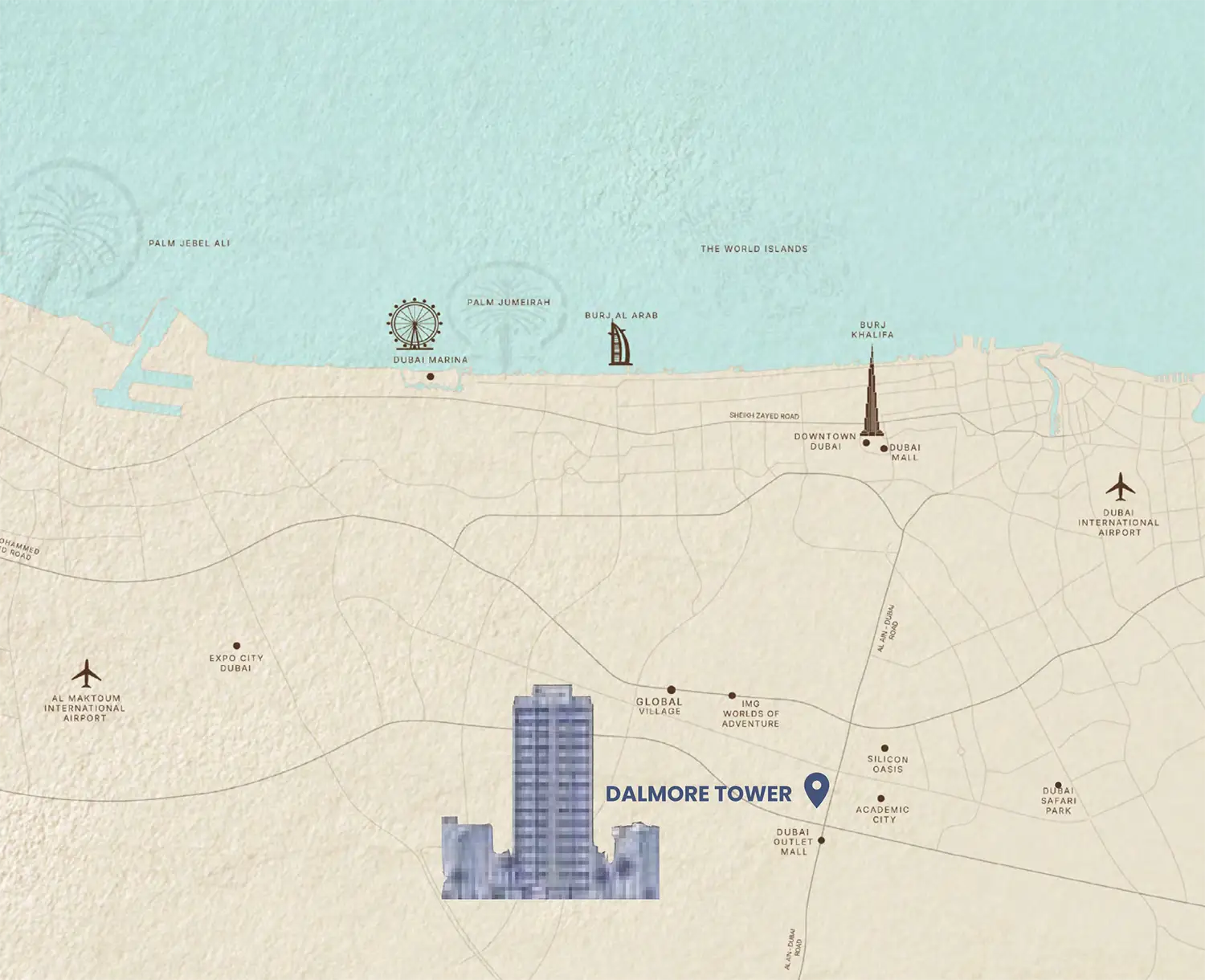 Dalmore Development presents Dalmore Tower a master-planned community from a new angle on modern living in dynamic. Family-focused locations at the new vibrant, pulsating heart of the Dubai Land Residence Complex (DLRC). This carefully-crafted dwelling serves as a beacon of refinement while surrounded by gentle nature and shall we say, sanitized suburbia. Nestled in the heart of this development, every detail has been carefully curated to enhance lifestyles, with award-winning amenities designed for families.