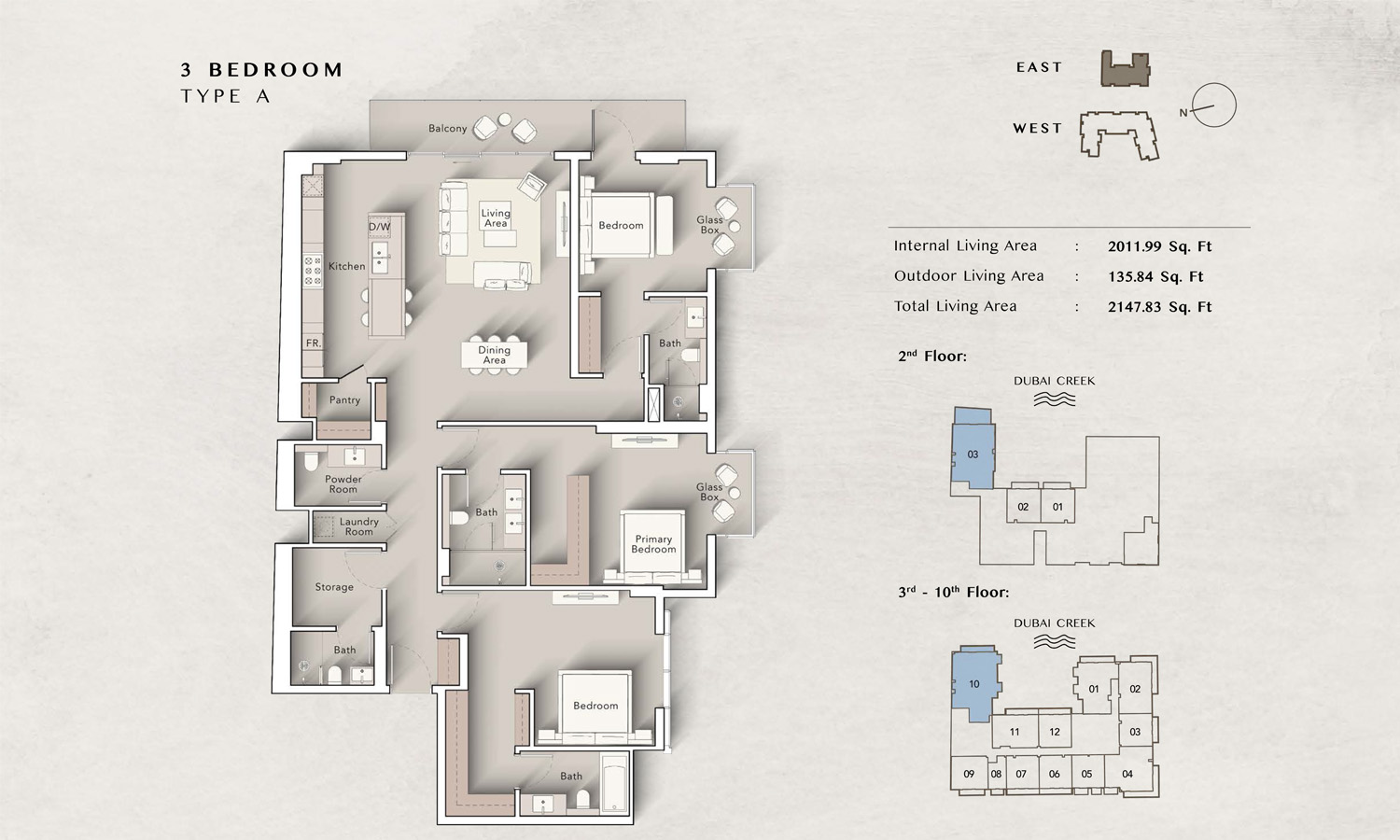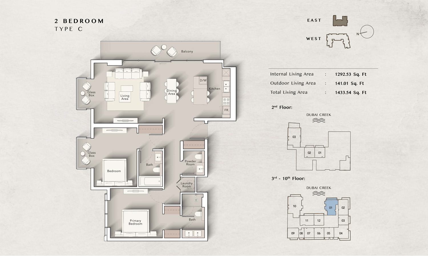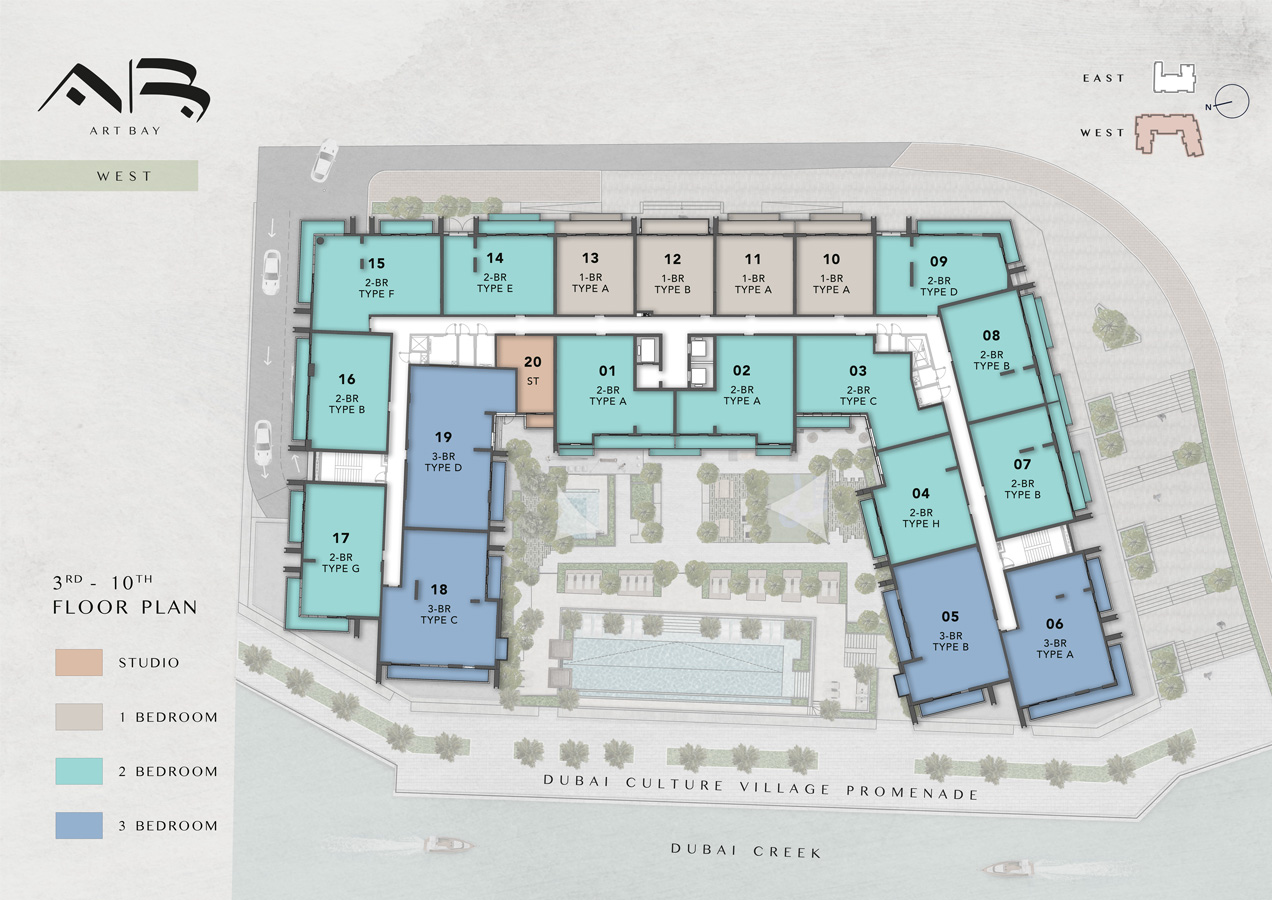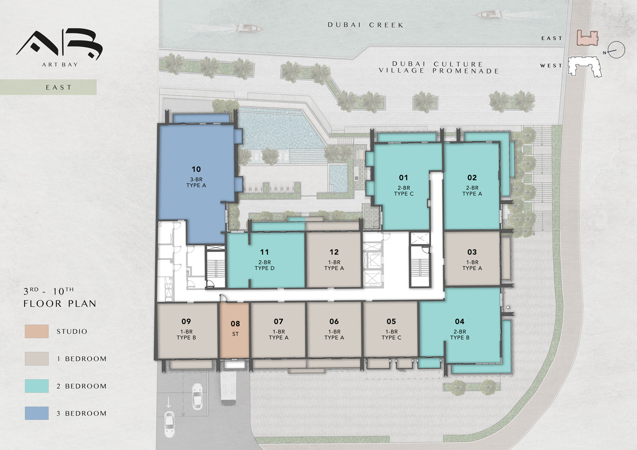 The Art Bay East Tower floor plans by Ellington Properties offers studios to spacious 3-bedroom apartments, with an enormous size variation. 8 Studio units introduce an efficient living space starting at 430 square feet, while all 50 1-bedroom units are much larger and range between 862 to 959 square feet. For those seeking even more living room space, there are 32 2-bedroom units that vary from 1211 to 1692 square feet, while all 9 3-bedroom units go to 2147 square feet. Large windows and big balconies allow more natural light and ventilation in space.