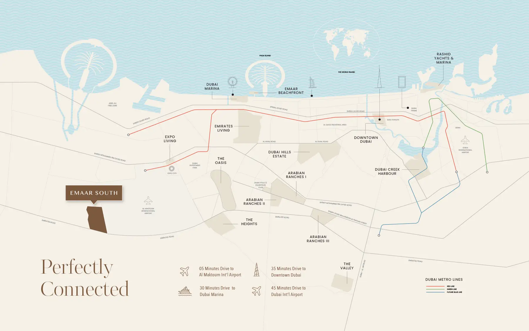 Strategically set at Golf Verge at Emaar South, Dubai, this makes for the perfect blend of accessibility, tranquility and connectedness. As Al Maktoum International Airport expands over subsequent years, convenient access to Dubai's key points of interest via Sheikh Mohammed Bin Zayed Road and Emirates Road makes commuting from the community easy. The peaceful yet family-oriented environment strongly highlights everyday convenience with the vibrant local vicinity capitals in Dubai Investment Park, which accommodates many businesses, educational establishments and medical centres respectively. It offers you not only the easy access to the services you'll need every day but you'll be living in the core of the one community shaping and evolving Dubai.