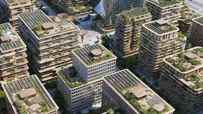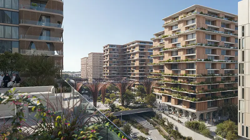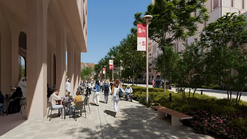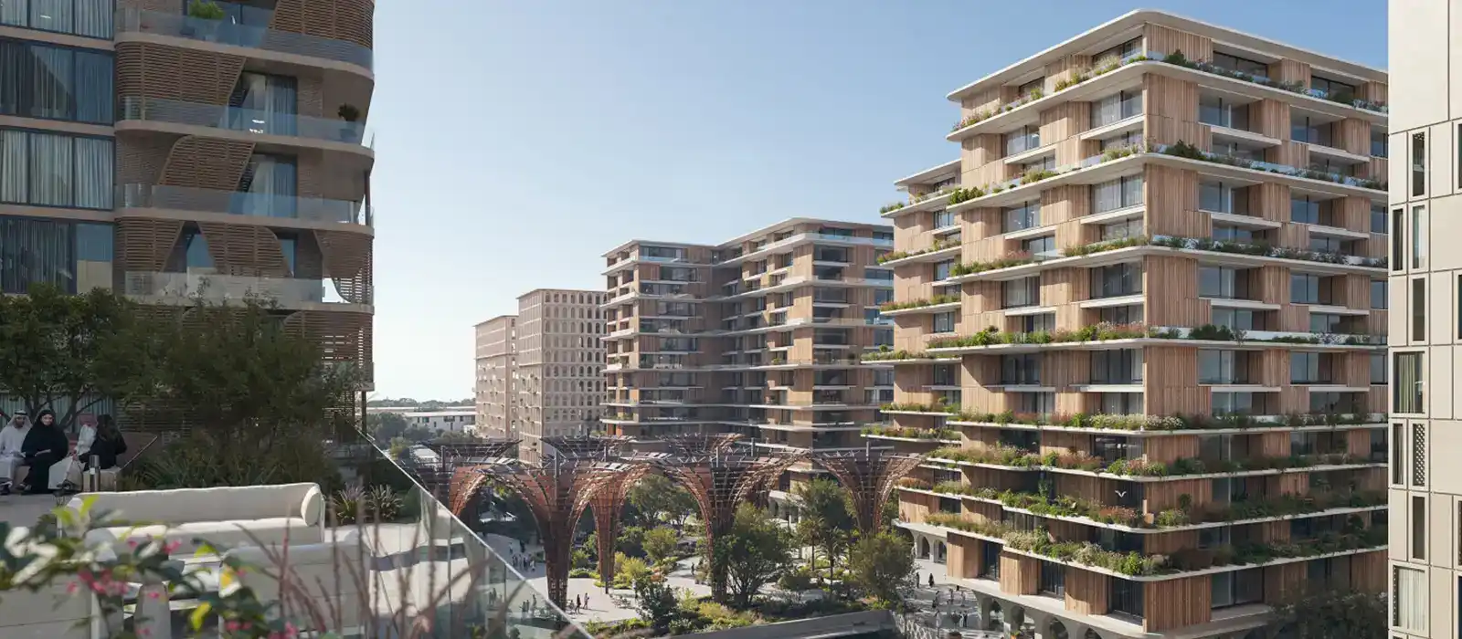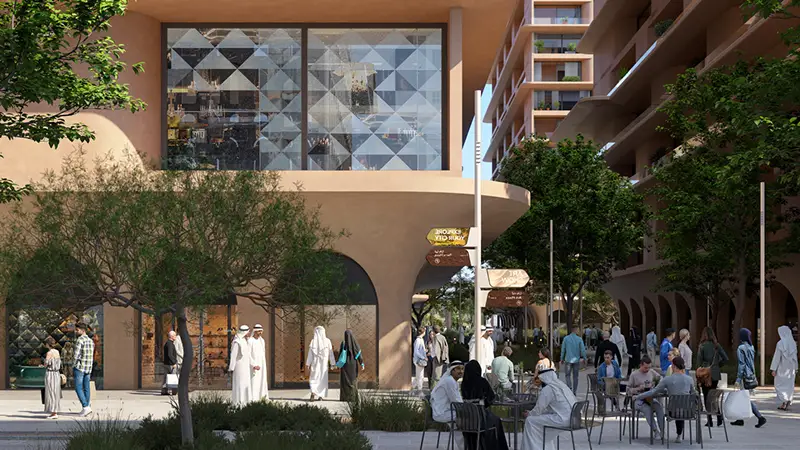 - Wadi-inspired parks, jogging paths, and wellness centers within the district.