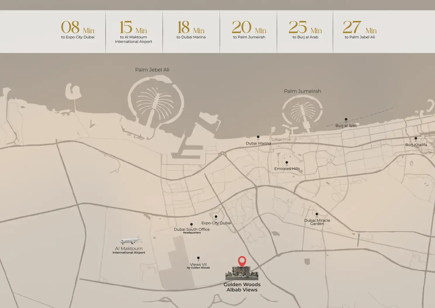 Golden Woods Albab Views is located within the Dubai South district that is a master planned area having a wide range of residential and commercial space within Dubai. The prime location of this community is an added advantage for residents due to convenient access to major highways such as Emirates Road and Sheikh Mohammed Bin Zayed Road. It provides easy access to key destinations of Dubai such as Expo City, Palm Jabel Ali, Dubai Marina, Downtown Dubai, Palm Jumeirah and Dubai Miracle Garden. The locality also has proximity to international level schools, hospitals, hotels, shopping malls and recreational spaces, which is an added advantage for those residents who prefer to have all facilities in neighborhood.