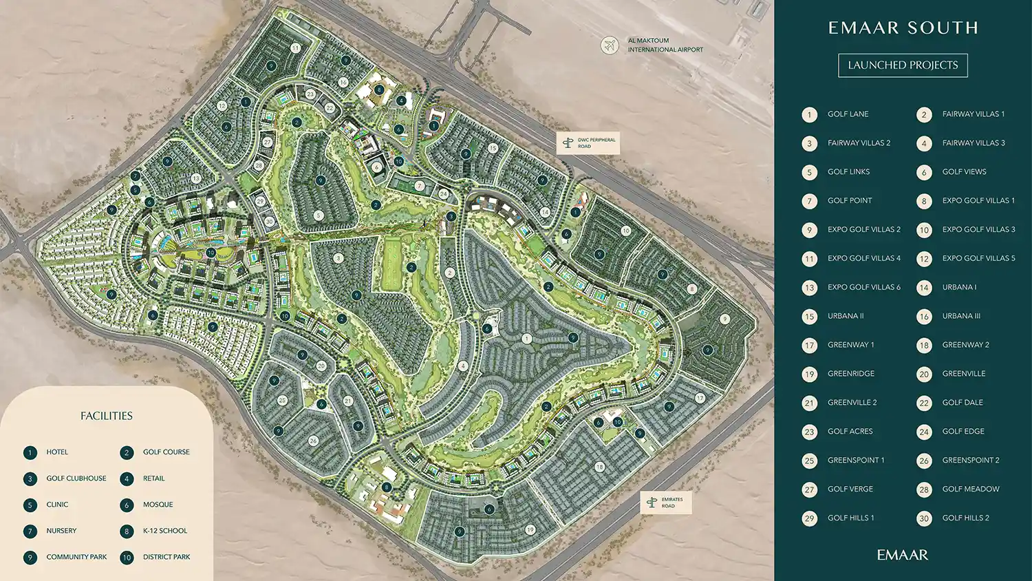 The master plan of Golf Hills 2 is offered by Emaar Properties to create a range of luxurious homes at upcoming Dubai South district. The builder has kept its focus on providing every kind of amenities required for urban convenience of Dubai and to offer a comfortable living standard. There is a provision for smart security systems and round the clock security guard to provide privacy and security to its residents. The master plan of property is having provision for lush green, landscaped area, parks and gardens to create a peaceful environment.