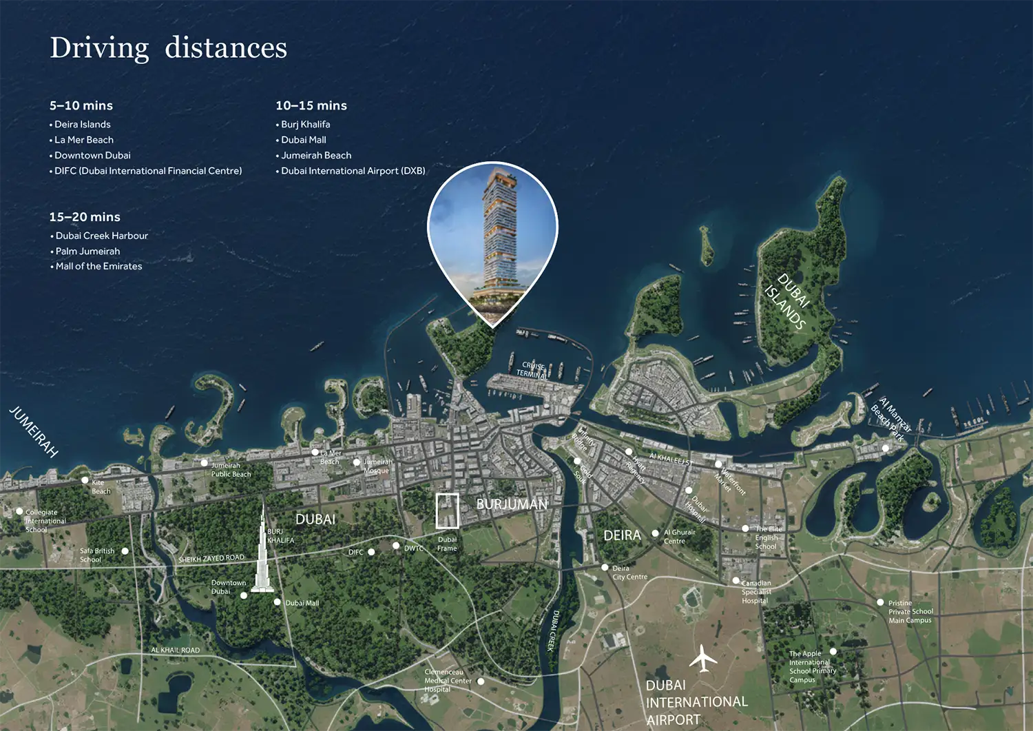 Hilton Residences is located at Dubai Maritime City, that has well connectivity to all the kay areas of the city. It is just 15 minutes from Downtown Dubai, where it offers an easy and effortless access to the most iconic destinations of the city. It includes Burj Khalifa, Dubai Mall, and the vibrant Boulevard. Residents living here can enjoy a seamless connection to world-class dining, luxury shopping, and cultural attractions that makes life very comfortable with both convenient and exceptionally elevated. Perfectly positioned with seamless access to Dubai’s highlights, including Dubai International Airport, Burj Khalifa, Mall of the Emirates, Palm Jumeirah, and Dubai Marina that is reachable within just 15 to 25 minutes.