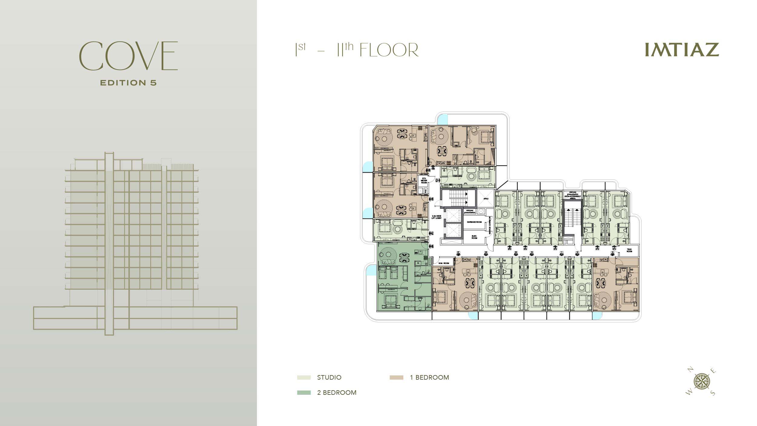 The floor plans of Cove Edition 5 offer studios and 1 & 2-bedroom apartments with all diverse amenities and facilities at Dubailand. This 11-storey building offers various types of home with smart and modern features. Interiors are crafted with fine attention keeping in mind the maximum utilization of maximum space. Each bedroom has attached bathroom and have wide windows and balcony with beautiful view. Living area is attached with dining space makes it comfortable for the movement of guest and host both. Inside atmosphere is airy and bright with the help of windows and wide balcony. Beside the balcony seating areas are made that makes the place cozy and luxurious.