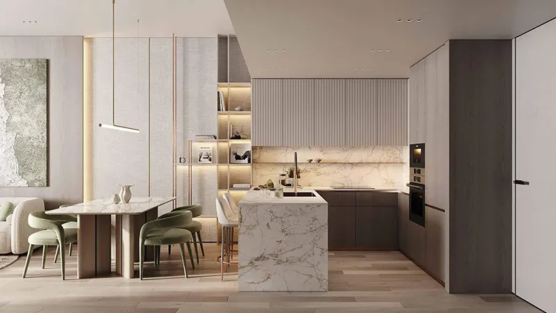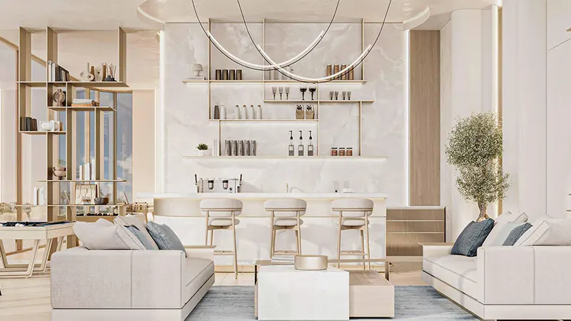 The residences living here shows special craftsmanship, showing best designs that offer both serenity and comfort. The interior environment features soft neutral palettes, high-quality finishes, and lighting. It promotes a sense of stylish relaxation. The architecture balances interior and exterior spaces through the use of gold accents, natural wood elements, and large windows. Each design detail has been thoughtfully selected to unify sophistication and comfort in a organized, pleasant setting.