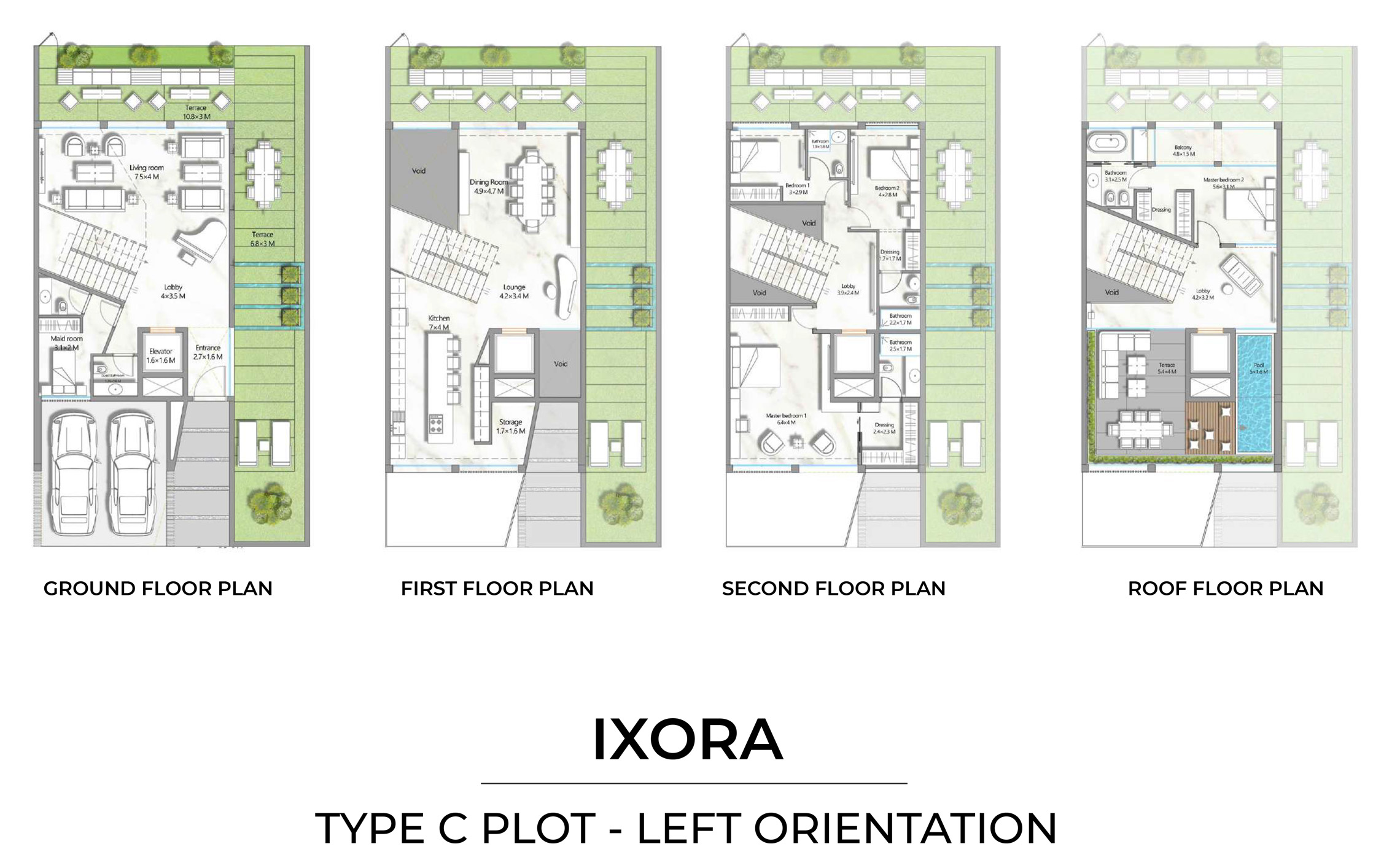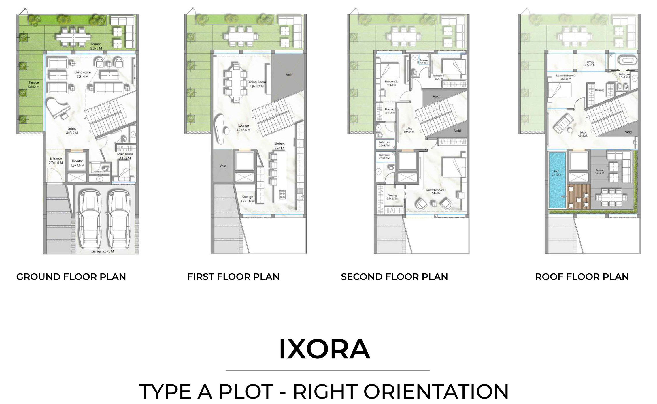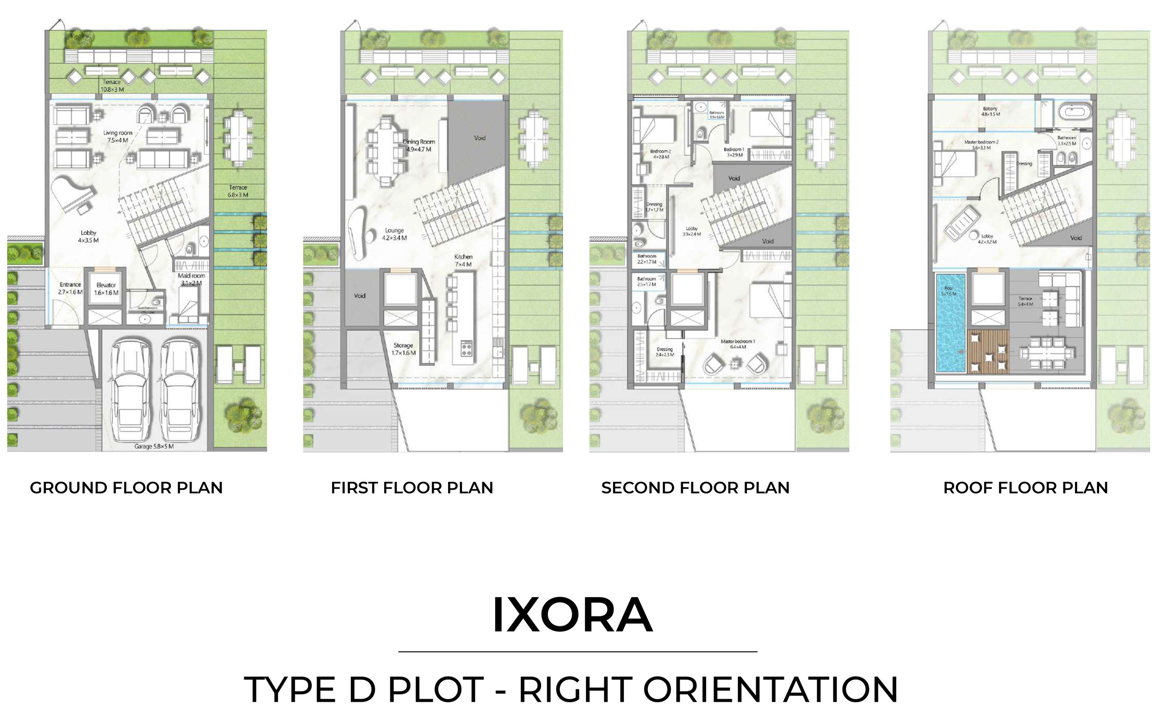 The IXORA Homes floor plan offers an ultimate collection of spacious and luxurious 82 exquisite designed 4 bedroom villas at Al Barari area, every villa comprises of 3 levels (G+1+2+R) and the size start from 4,791 sq.ft. with the land plot size ranging from 1,936 to 2,582 sq.ft.: the developer thoughtfully designed these homes so that all the carpet area is used to its full potential.