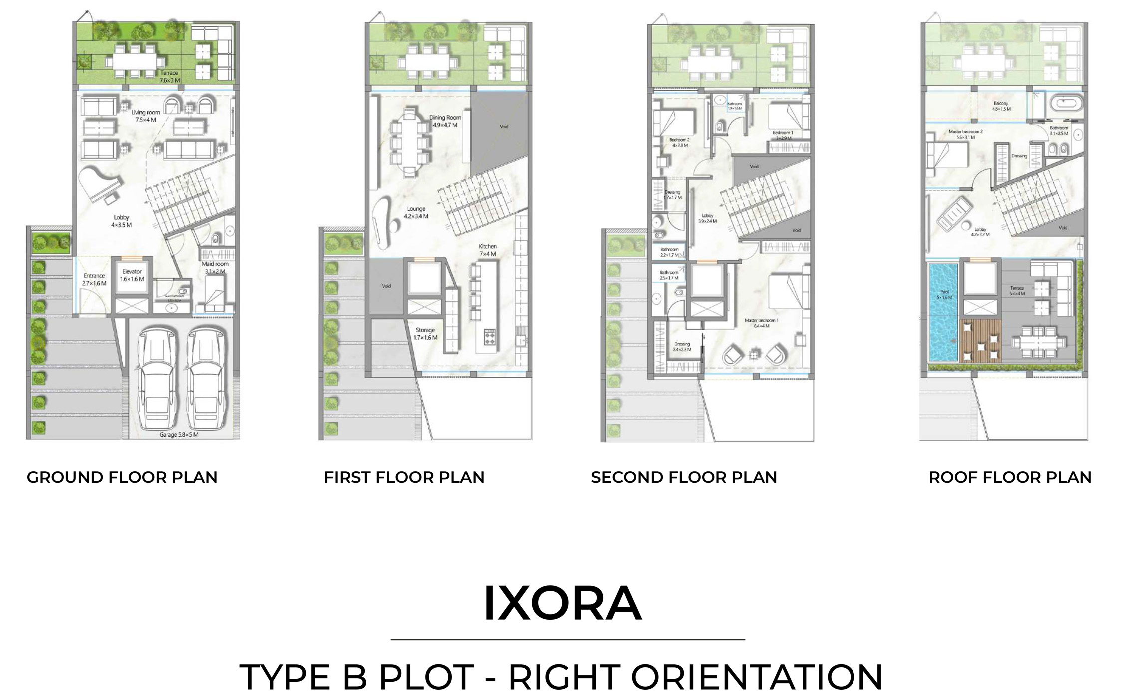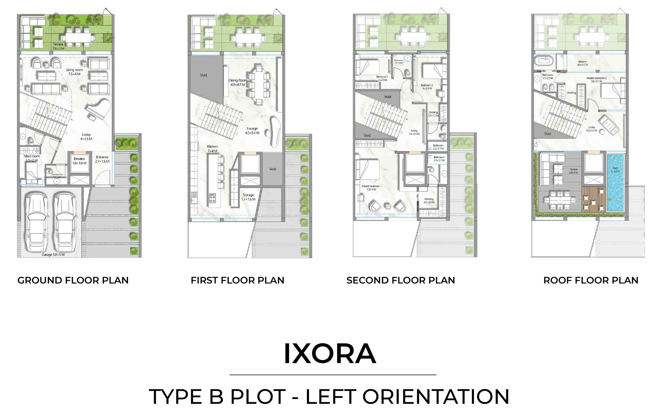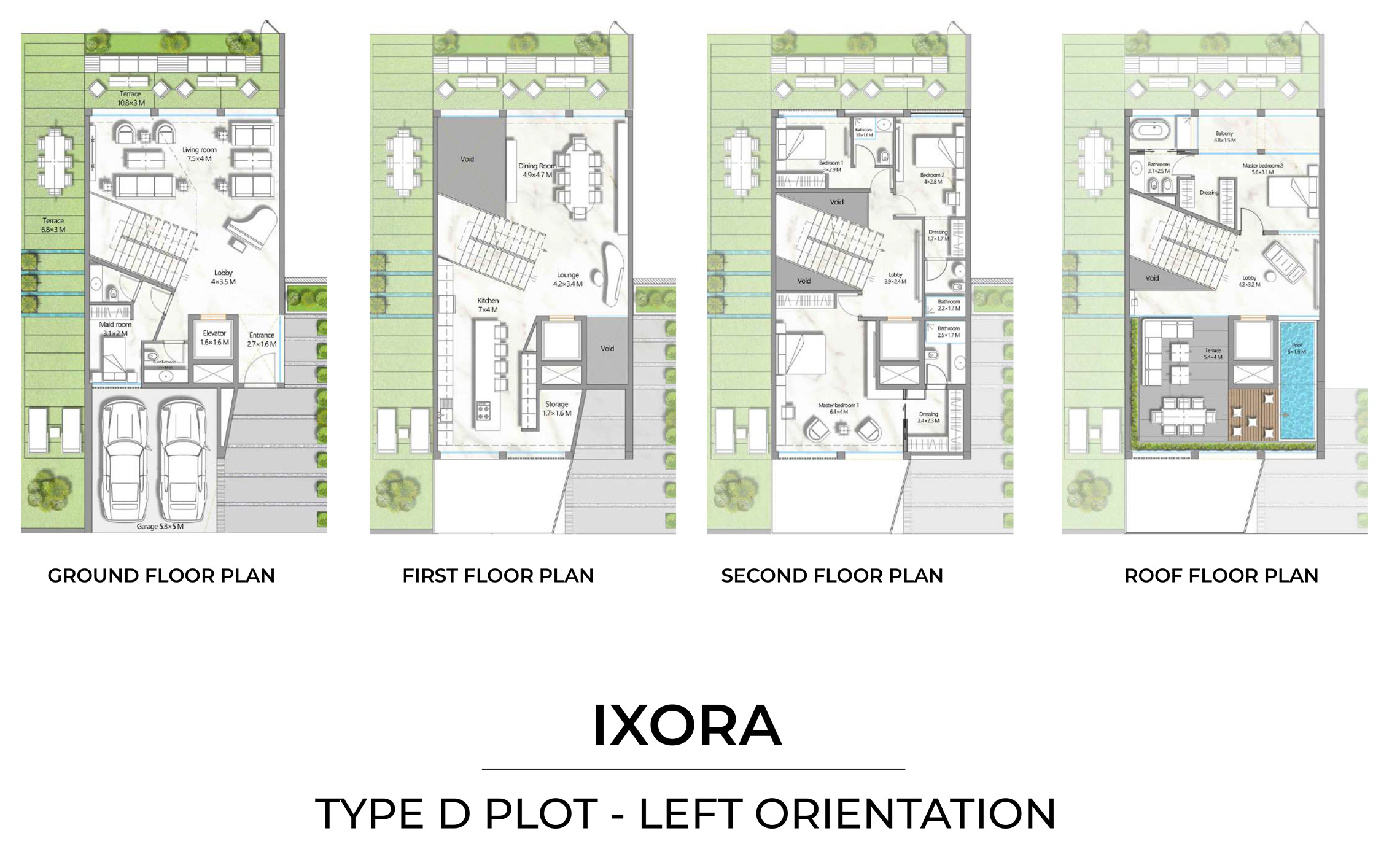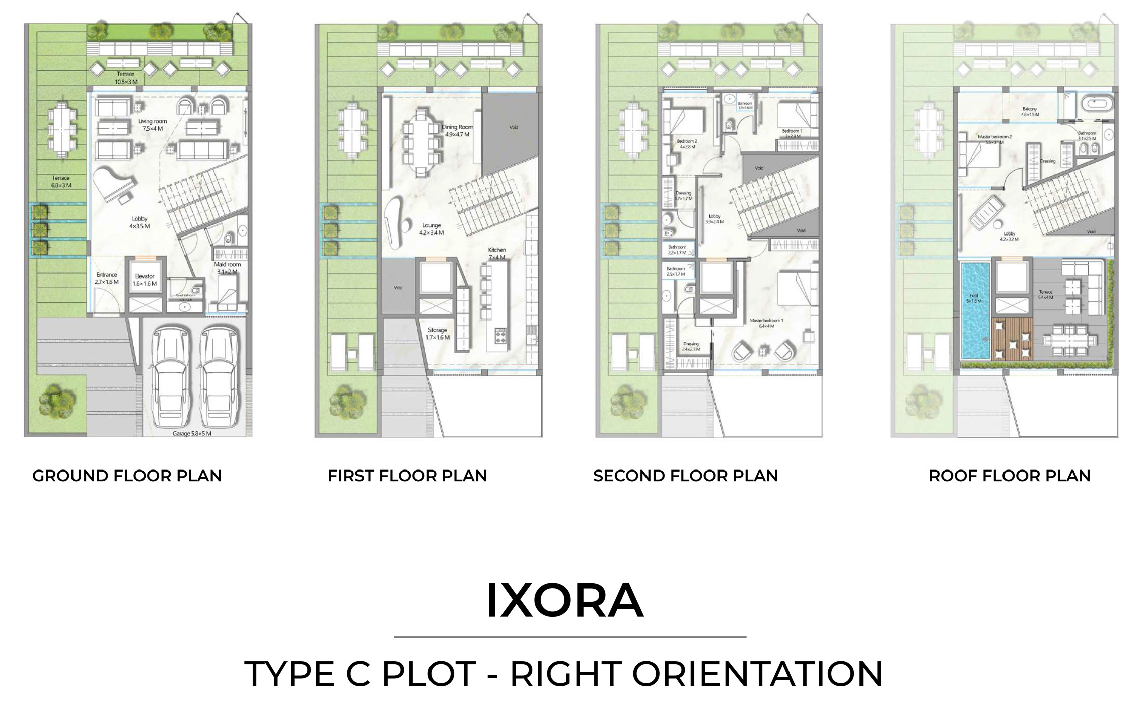 The IXORA Homes floor plan offers an ultimate collection of spacious and luxurious 82 exquisite designed 4 bedroom villas at Al Barari area, every villa comprises of 3 levels (G+1+2+R) and the size start from 4,791 sq.ft. with the land plot size ranging from 1,936 to 2,582 sq.ft.: the developer thoughtfully designed these homes so that all the carpet area is used to its full potential.