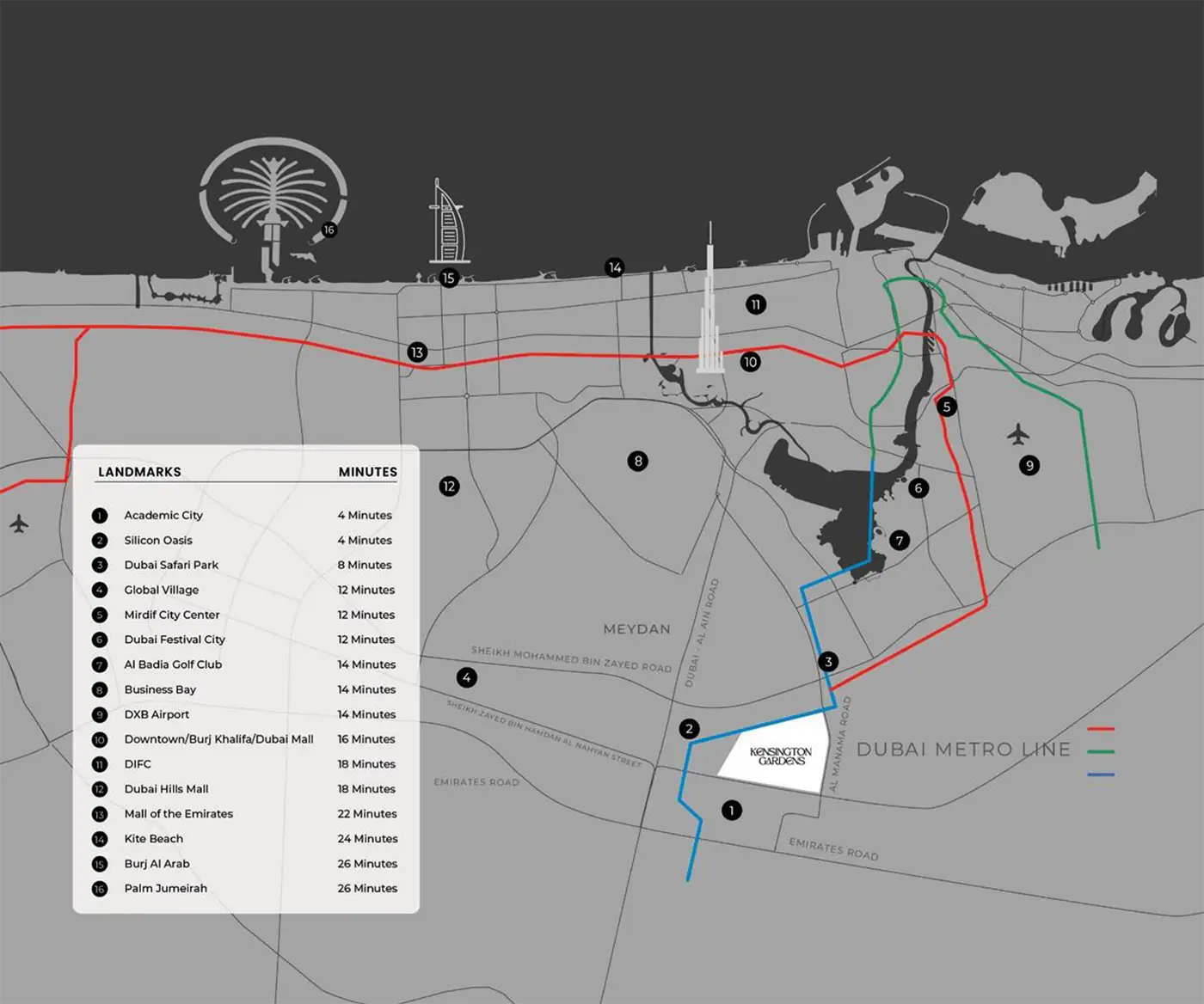Kensington Gardens is a new residential development located in the heart of Dubai, within the Greenwood community at International City Phase 2. It is located near Sheikh Zayed Bin Hamdan Al Nahyan Street. This community offers an excellent connectivity to the key highways that includes Sheikh Mohammed Bin Zayed Road (E311) and Emirates Road (E16). There is an easy way to the metro line ensuring continuous travel across Dubai. This location ensures seamless connectivity across the city, including key areas like the Industrial Zone, Silicon Oasis, Meydan’s corporate offices and racecourse, Business Bay, and Downtown Dubai. The expansive, sustainable community is thoughtfully designed to offer everything you need a retail and dining outlets, supermarkets, healthcare centers, parks, yoga spaces, outdoor gyms, schools, and crystal-clear lagoons all within easy reach.