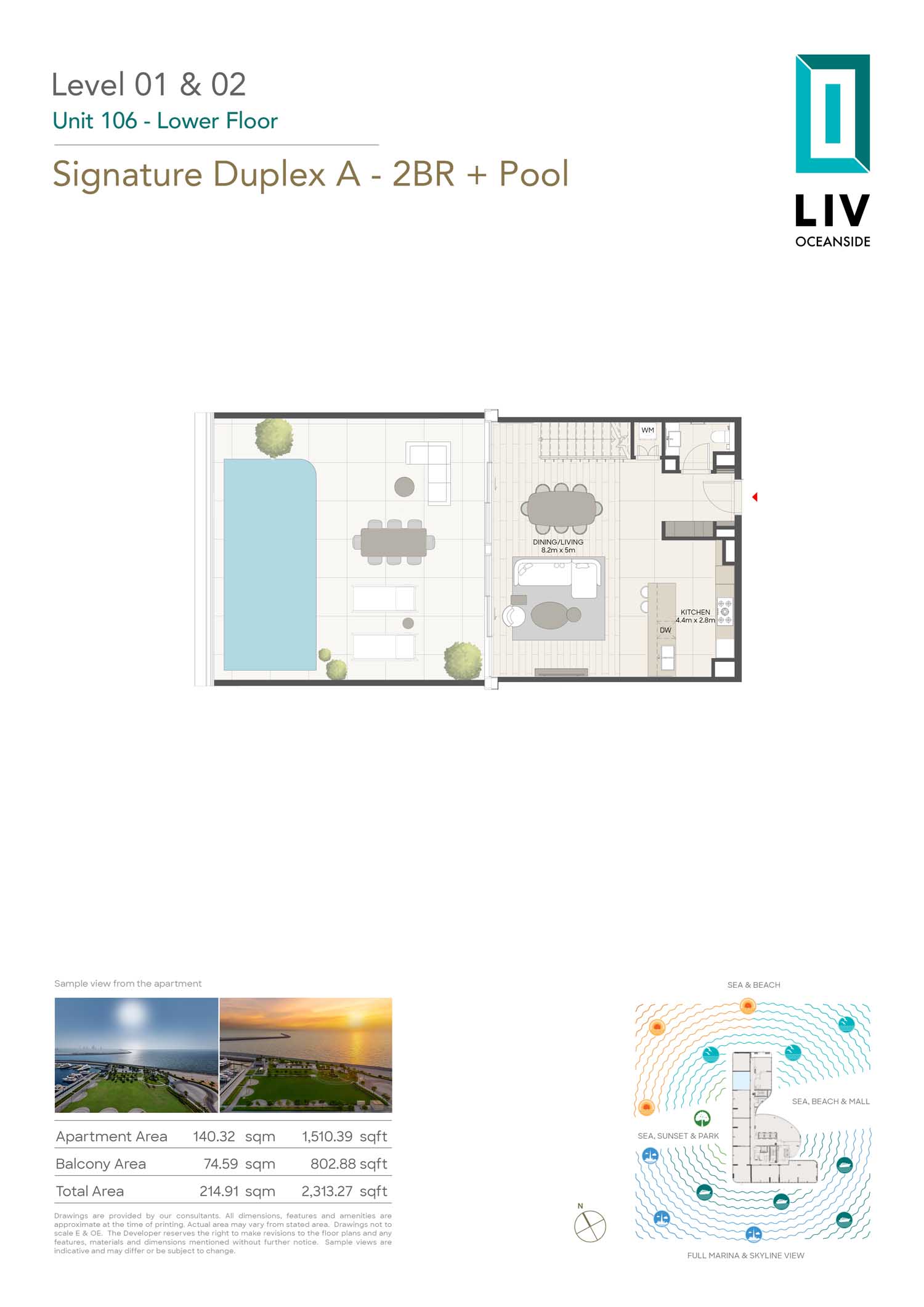 | Level 01 & 02 | 2 Bedroom + Pool | Unit 106 Lower Floor (Signature Duplex A 2BR) | 2313.27 Sq Ft | Apartments |