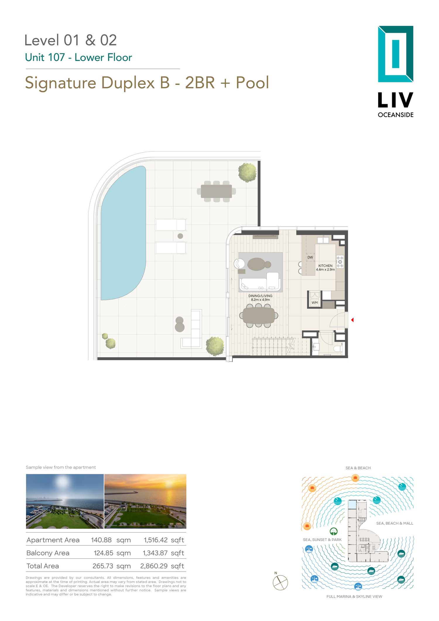 | Level 01 & 02 | 2 Bedroom + Pool | Unit 107 Lower Floor (Signature Duplex B 2BR) | 2860.29 Sq Ft | Apartments |