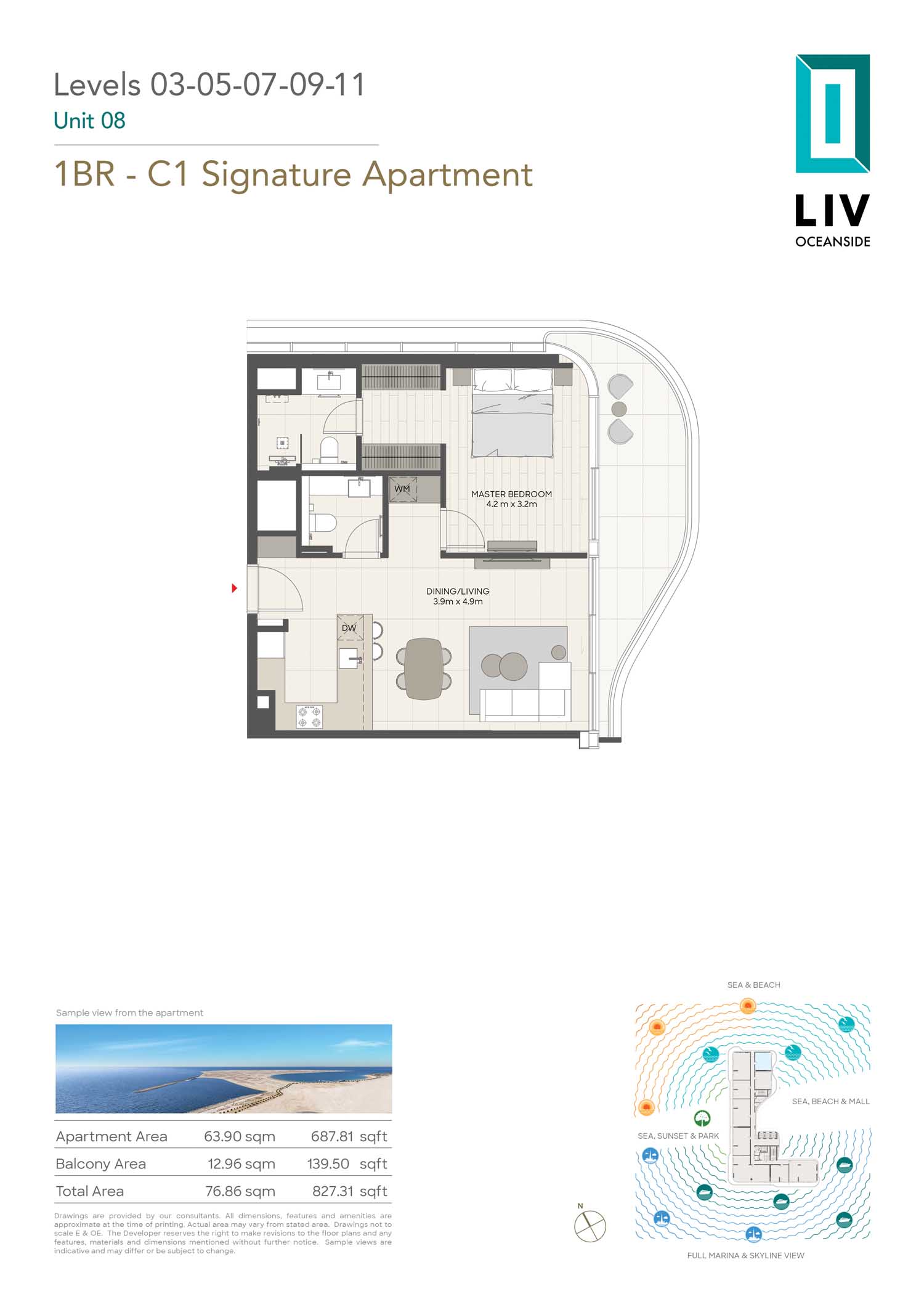 | Level 04 - 12 | 1 Bedroom | Unit 08 (1BR - C1 Signature Apartment) | 827.31 Sq Ft | Apartments |