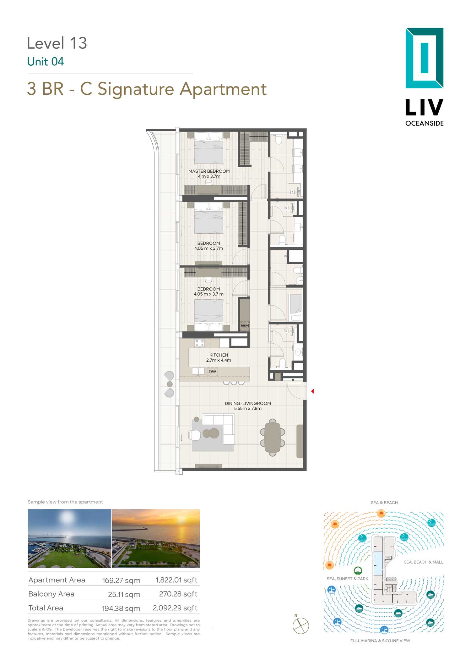 | Level 13 | 3 Bedrooms | Unit 04 (3BR C - Signature Apartment) | 2092.29 Sq Ft | Apartments |