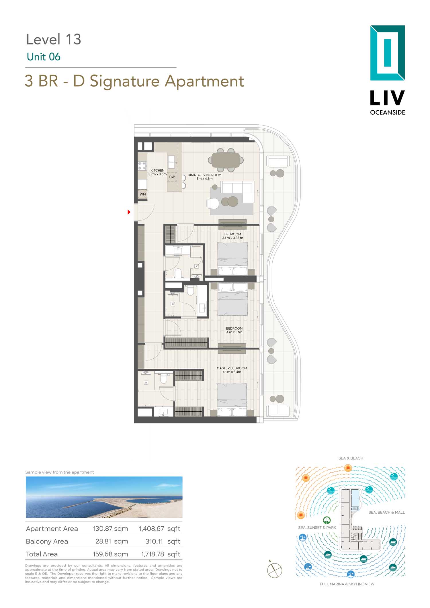 | Level 13 | 3 Bedrooms | Unit 06 (3BR D - Signature Apartment) | 1718.78 Sq Ft | Apartments |