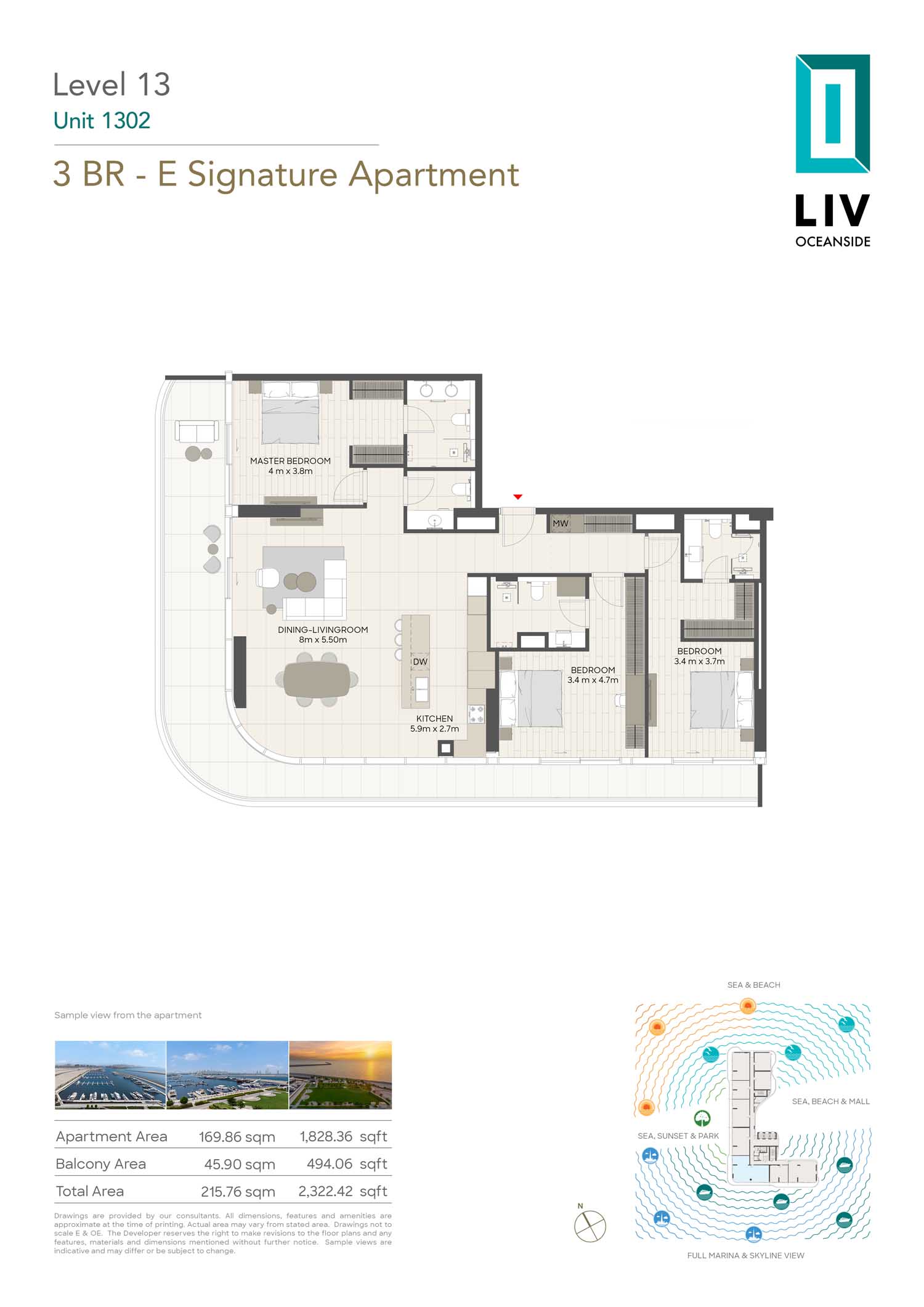 | Level 13 | 3 Bedrooms | Unit 1302 (3BR E - Signature Apartment) | 2322.42 Sq Ft | Apartments |