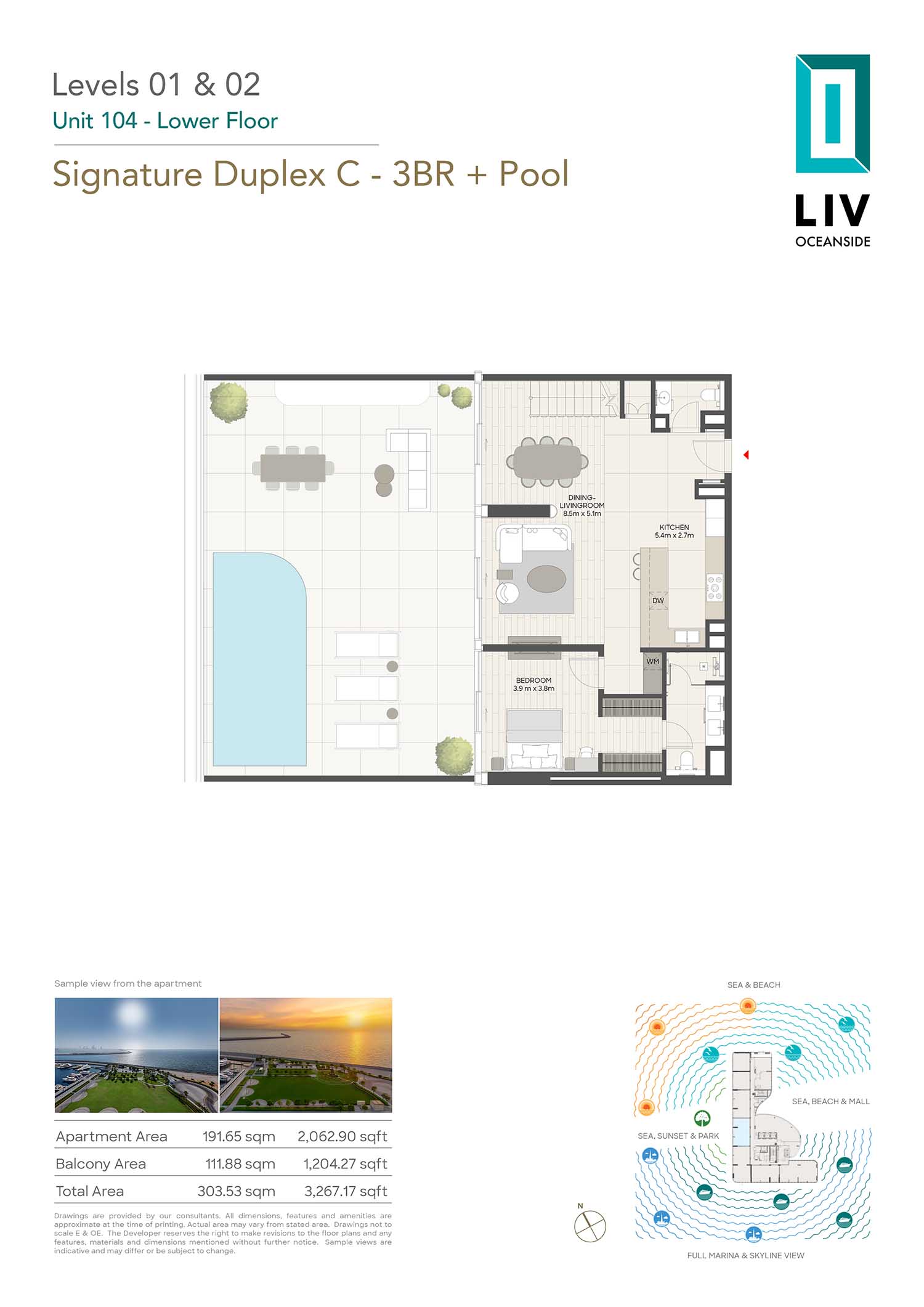 | Levels 01 & 02 | 3 Bedroom + Pool | Unit 104-Lower Floor (Signature Duplex C) | 3267.17 Sq Ft | Duplex Apartments |