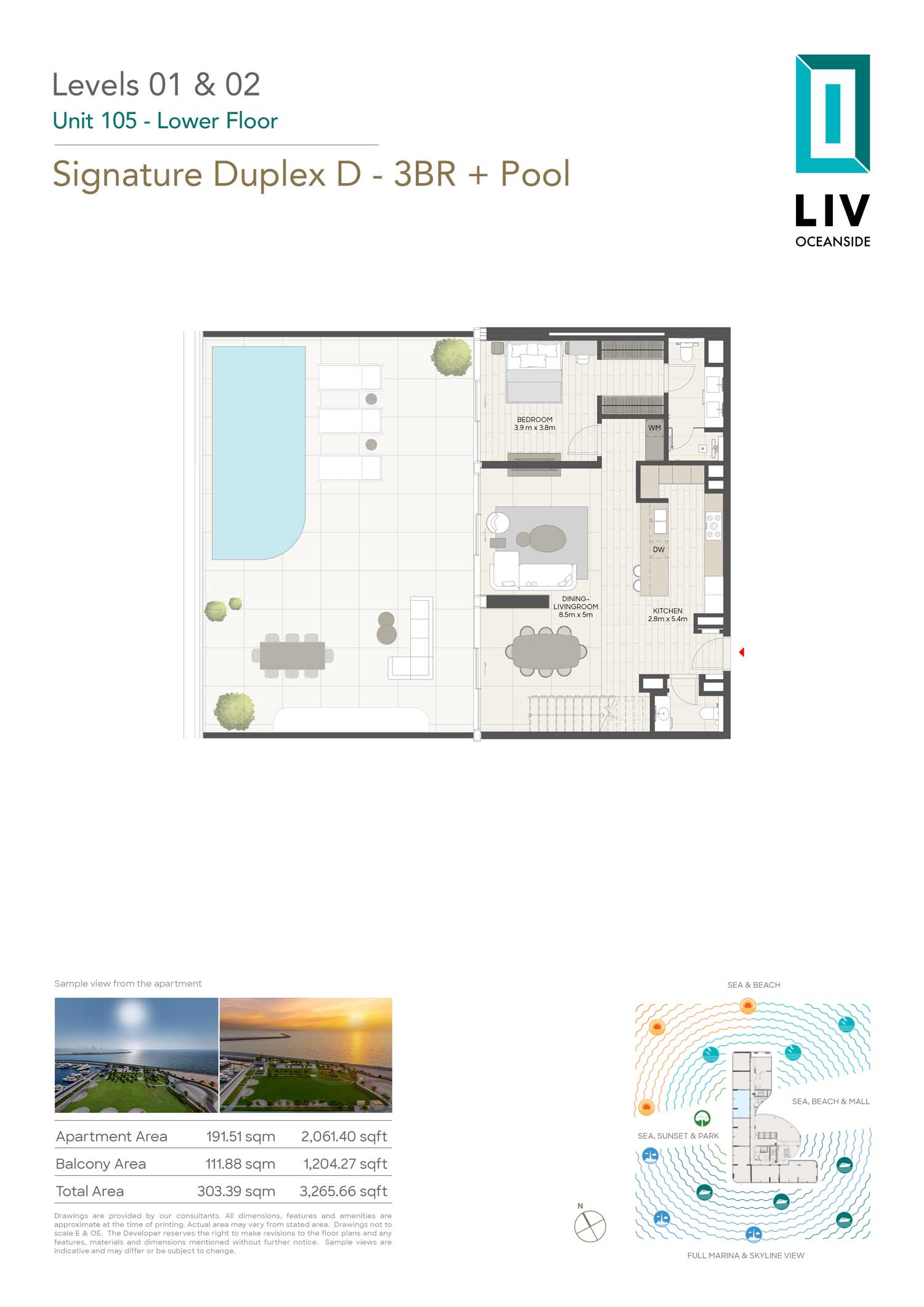 | Levels 01 & 02 | 3 Bedroom + Pool | Unit 105 Lower Floor (Signature Duplex D - 3BR) | 3265.66 Sq Ft | Duplex Apartments |