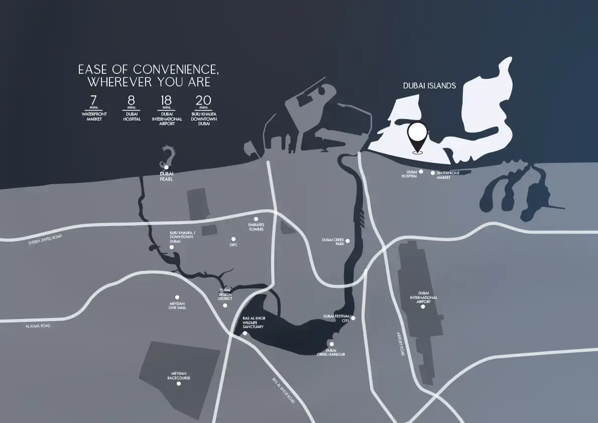 Luxury Canal Residences is situated within Dubai Islands, that offers an island like living style and offering an easy access to the vibrant urban areas. Offering an unrivaled position, Luxury Canal Residences allows residents to indulge in the serenity of a private island sanctuary, while remaining in close proximity to Dubai’s most celebrated landmarks. Dubai Islands stands as the largest waterfront development project in the region, designed to offer a high-end urban retreat. It features beautifully landscaped marinas, original beaches, exclusive five-star hotels, and world-class entertainment facilities. It ensures a luxurious living environment for residents and visitors both. With the help of highways and roadways various key attractions like Downtown Dubai, Dubai International Airport, and Palm Jumeirah are very easy to reach. This prime waterfront location offers luxurious living options while maintaining the convenience of city life. Moreover, future transportation systems and infrastructure enhancements will further elevate its accessibility and connectivity.