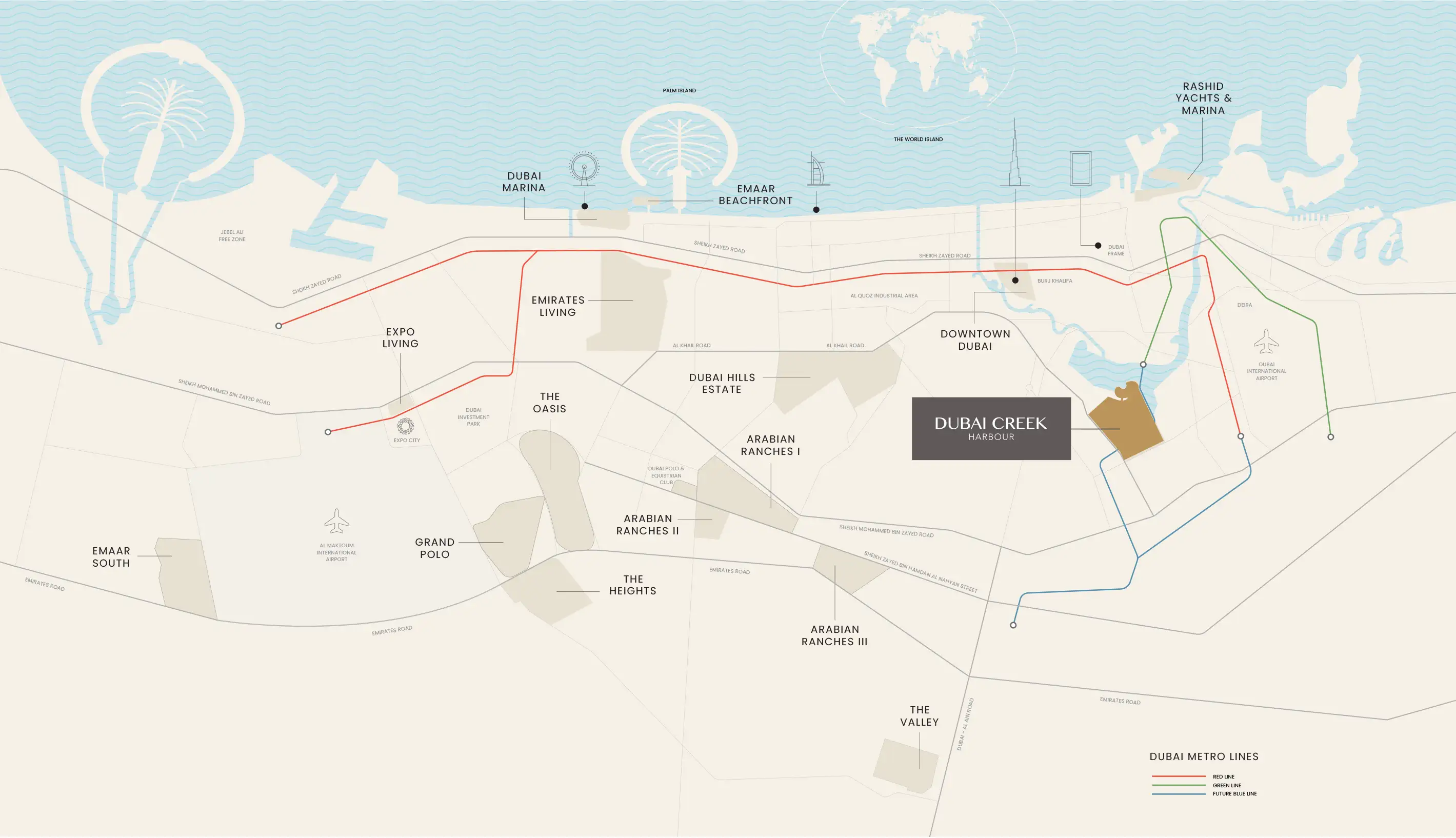 Lyvia by Palace is located at Dubai Creek Harbour which is a waterfront zone within the greenest community of Green Gate. From here there is seamless connectivity and it is very convenience. All the towers look stunning along with the stunning views of Creek water, lush and green landscape and the skyline of Downtown Dubai. There are various transportation routes such as metro stations, ferry terminals that easily connects the city with all its prime and important locations. Major roads like Nad Al Hamra and Al Khail Roads are connected to this project and it makes it very convenient to the residents to move around the Cultural Village, Zaabeel, Design District, Business Bay, and Downtown Dubai.