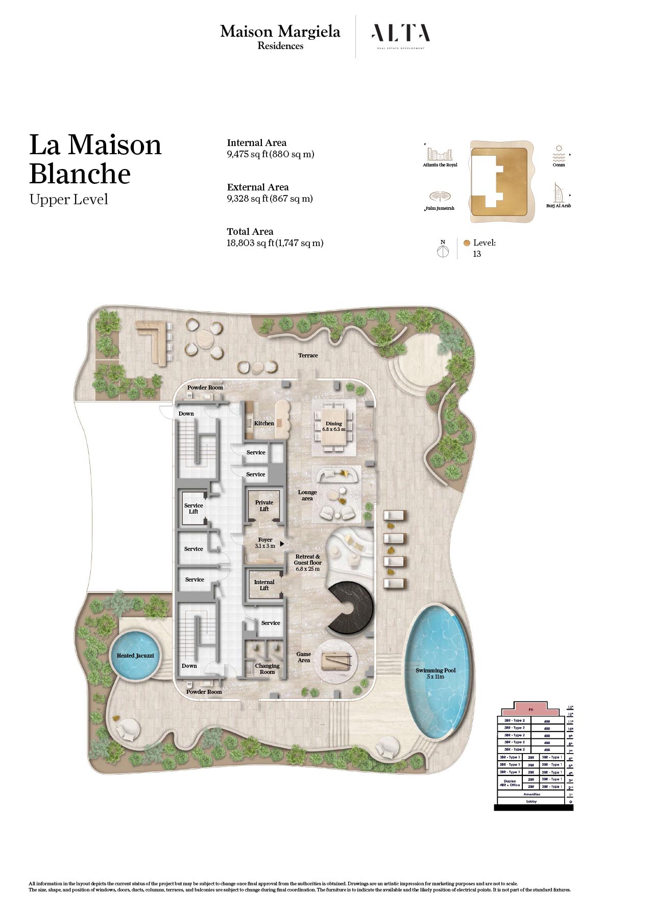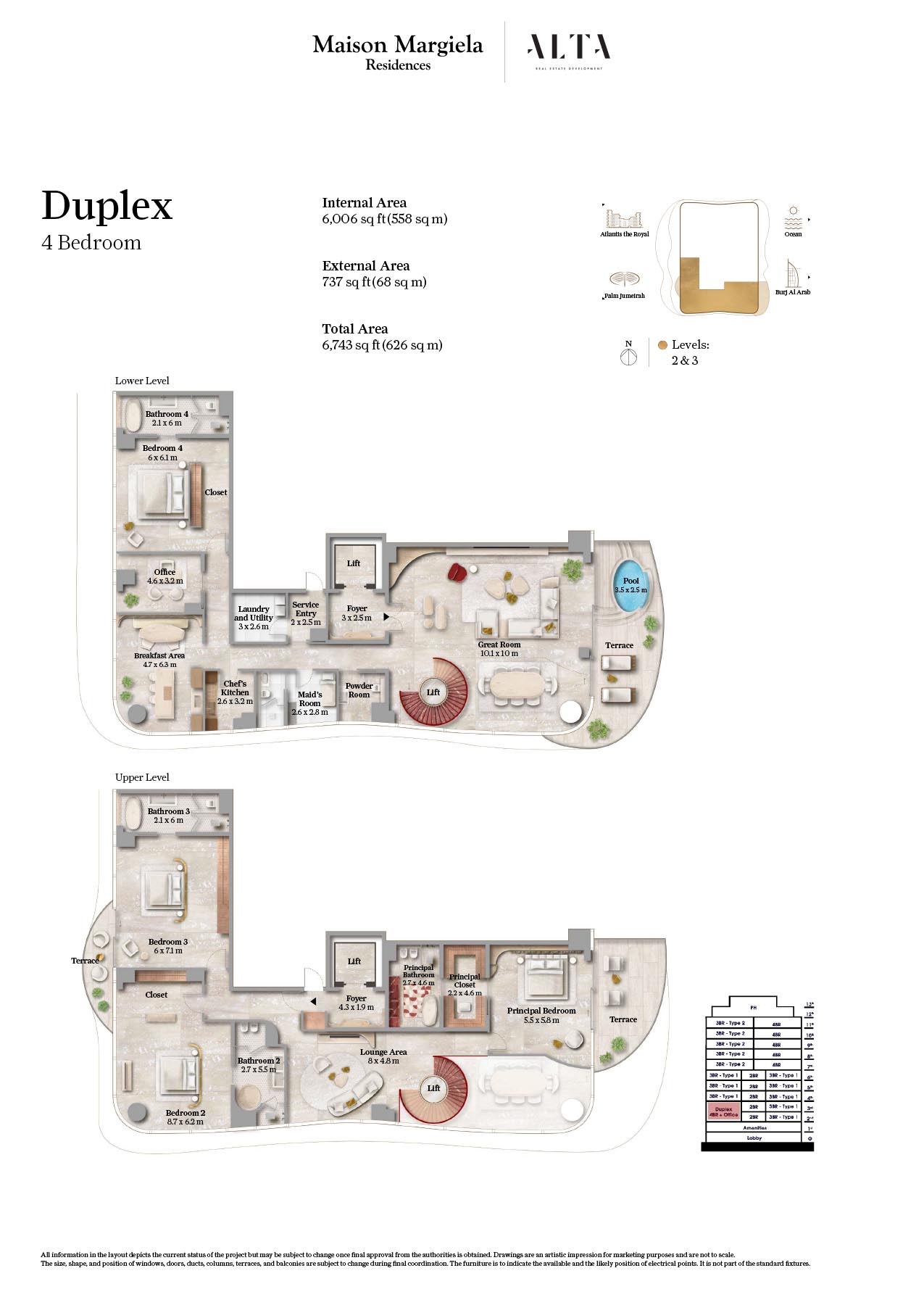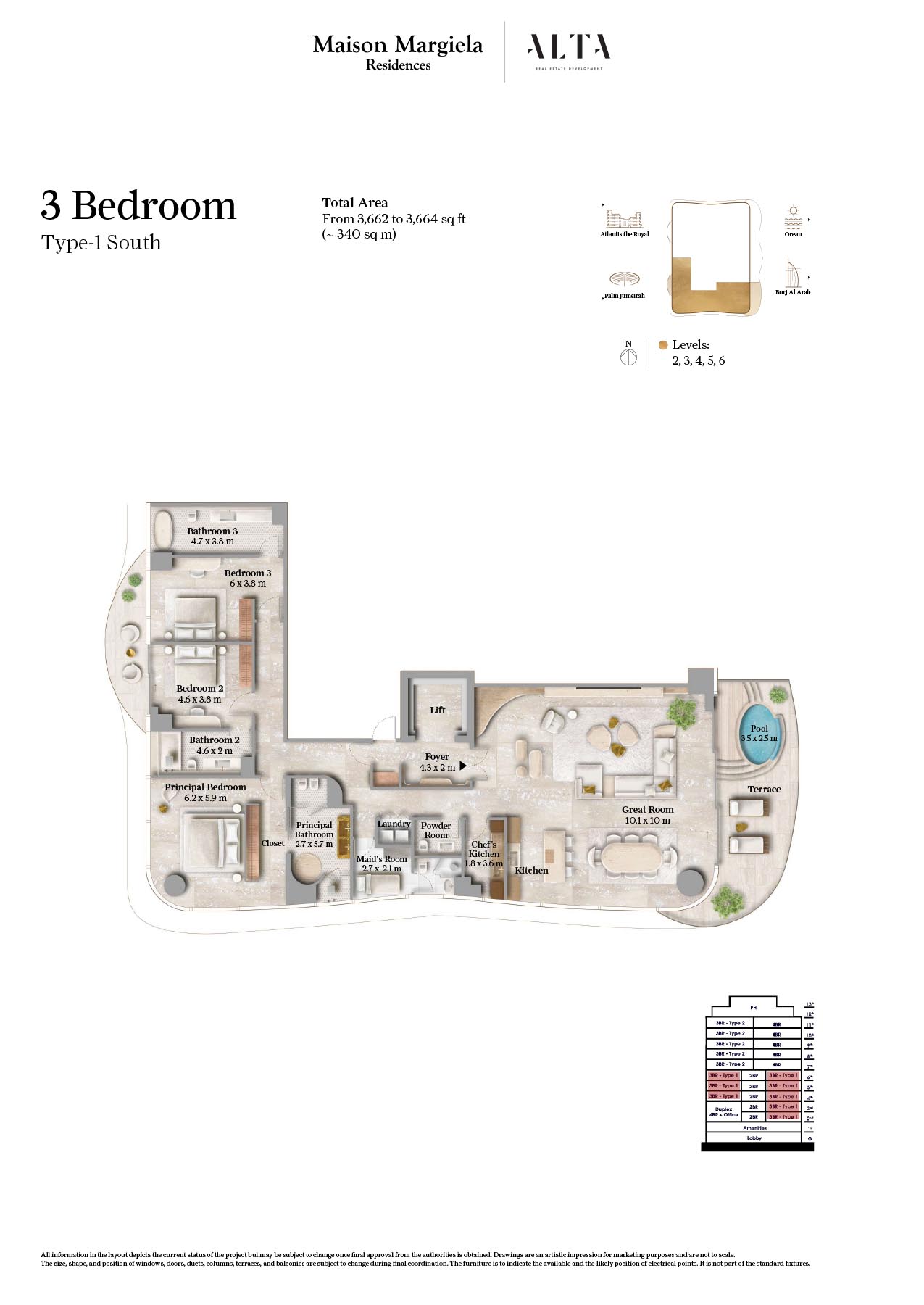 The floor plan for Maison Margiela Residences, in Palm Jumeirah, is a 14-storey building designed for providing comfort and luxury. One can find out their dream home at this sought-after address, where every residence features expansive layouts and timeless, elegant design in soothing neutrals. It offers standard size of bedrooms, with living room combined with dining area. Rooms are very spacious with attached bathroom and maximum storage capacity. Each unit are designed in such a way that it provides beautiful view of Arabian Gulf.