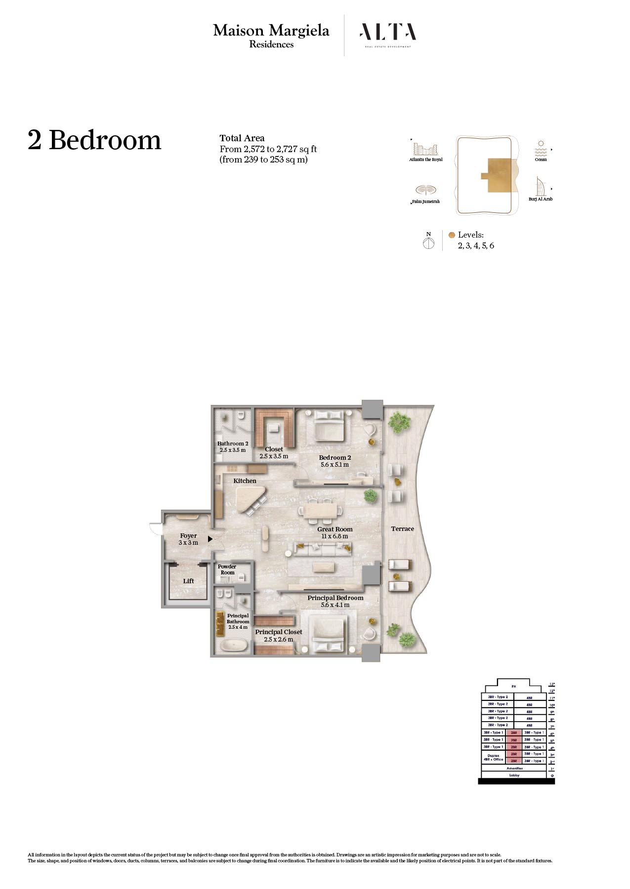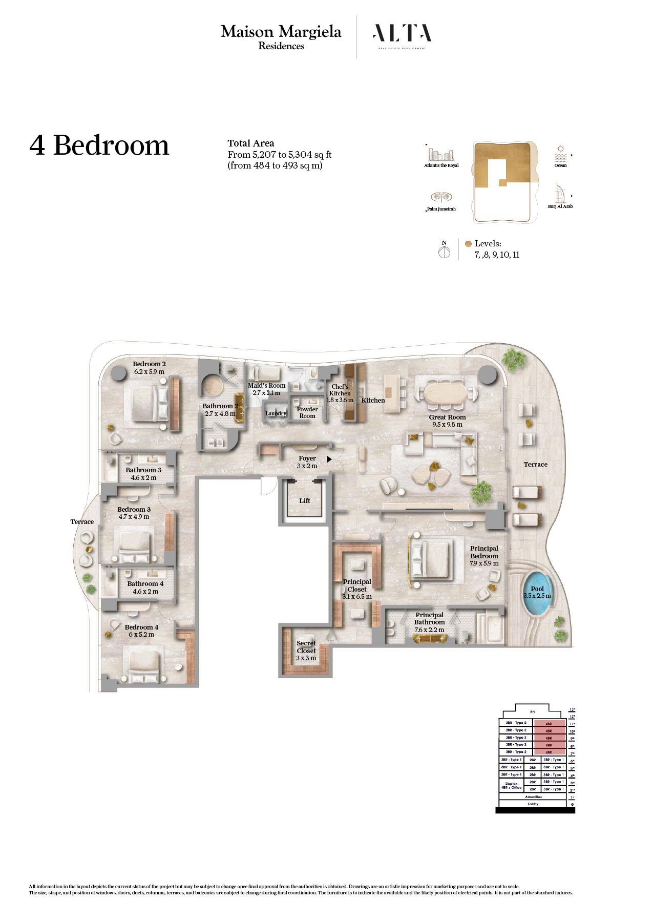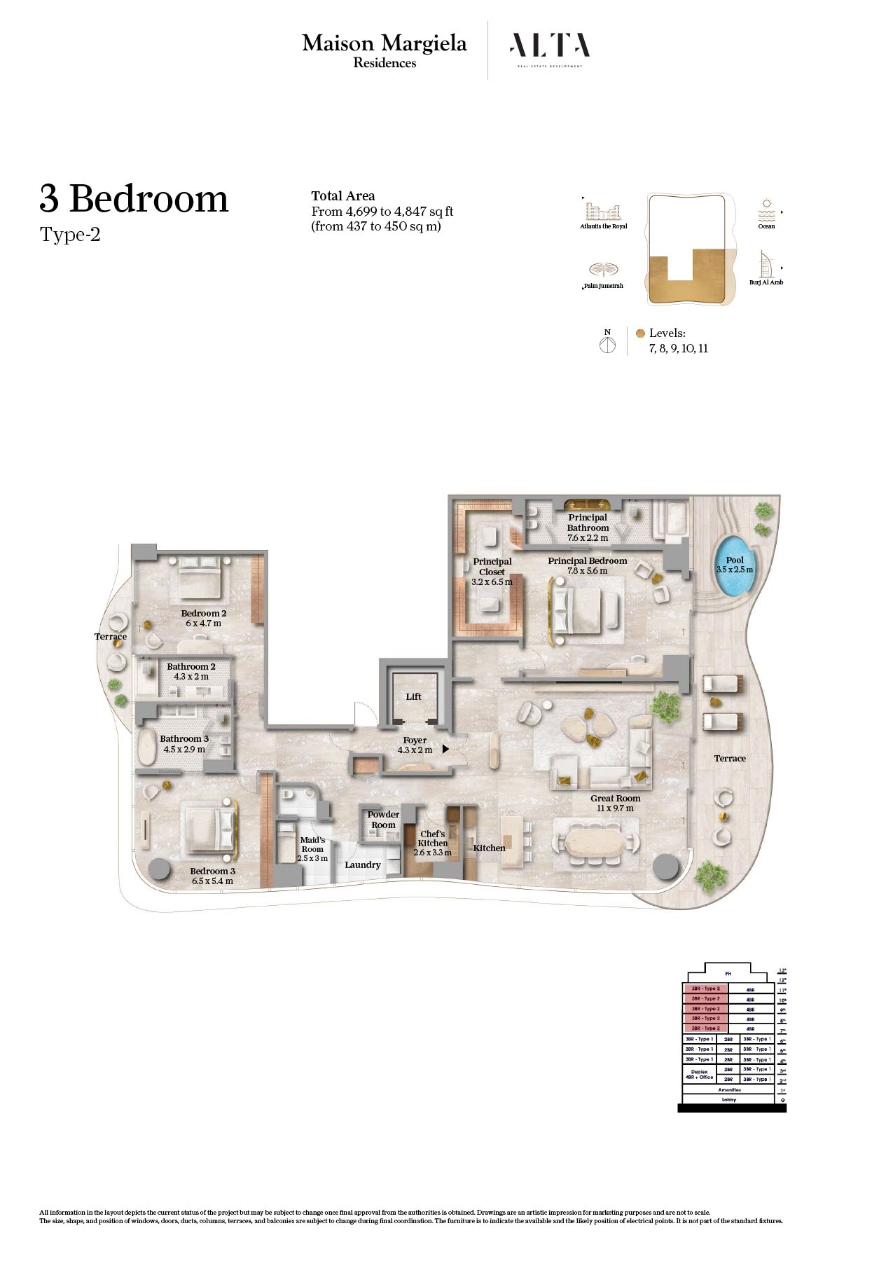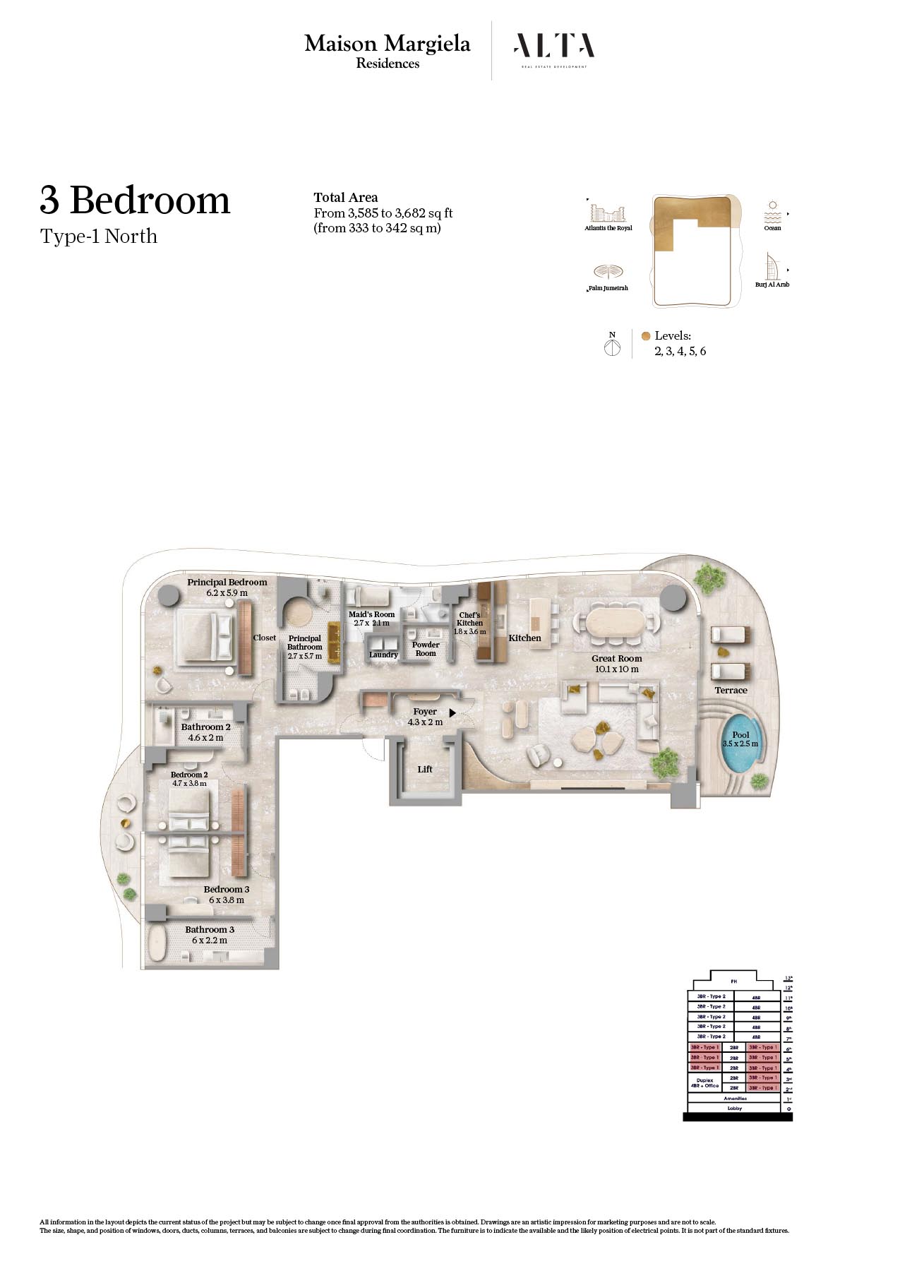 The floor plan for Maison Margiela Residences, in Palm Jumeirah, is a 14-storey building designed for providing comfort and luxury. One can find out their dream home at this sought-after address, where every residence features expansive layouts and timeless, elegant design in soothing neutrals. It offers standard size of bedrooms, with living room combined with dining area. Rooms are very spacious with attached bathroom and maximum storage capacity. Each unit are designed in such a way that it provides beautiful view of Arabian Gulf.