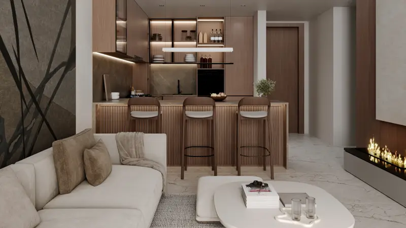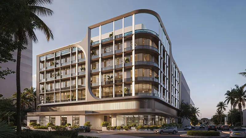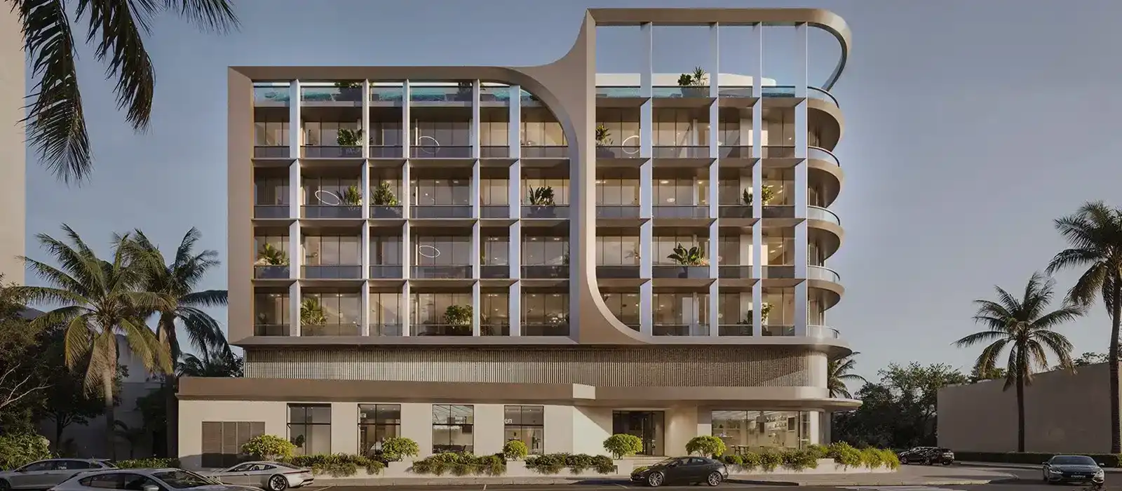 Comprising ground, podium and four residential levels, the complex has a floral inspired façade, organic form with white, earthy tones as well as sleek glass finishing. Elegant marble flooring, warm lighting, and sophisticated finishes offer a luxurious and welcoming aesthetic that also expresses timeless modernity upon entering the grand lobby.