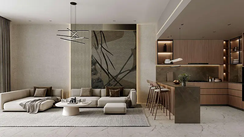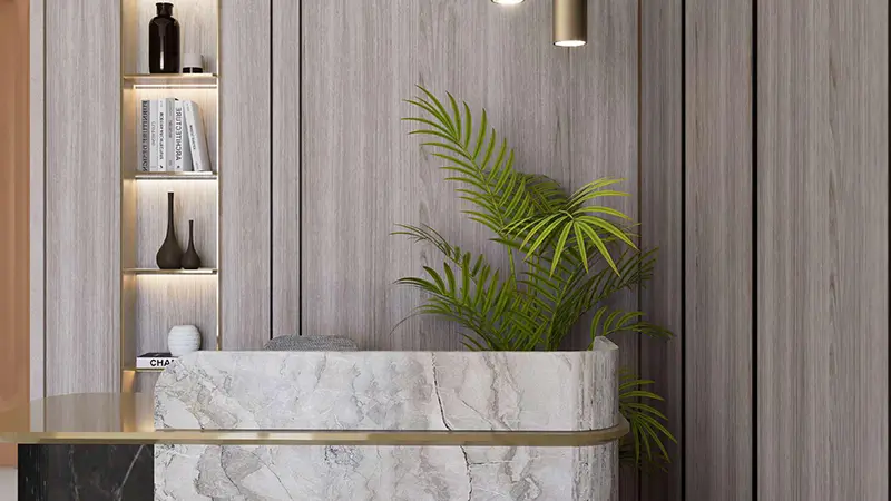 - Welcomes residents with a grand lobby that includes white marble tile, ambient lighting, and custom seating areas, forming a luxurious and inviting space.