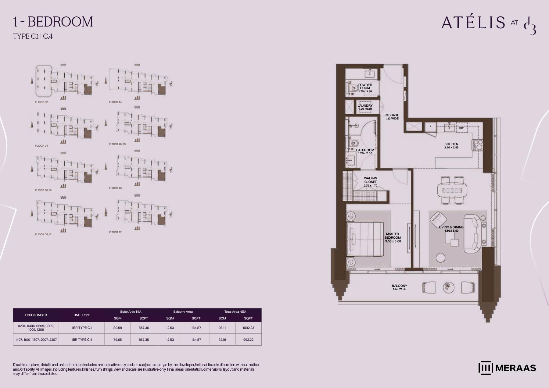 | Floor 02-22 | 1 Bedroom | Type C1-C4 (Unit 0204-2207) | 1002.23 Sq Ft | Apartments |
