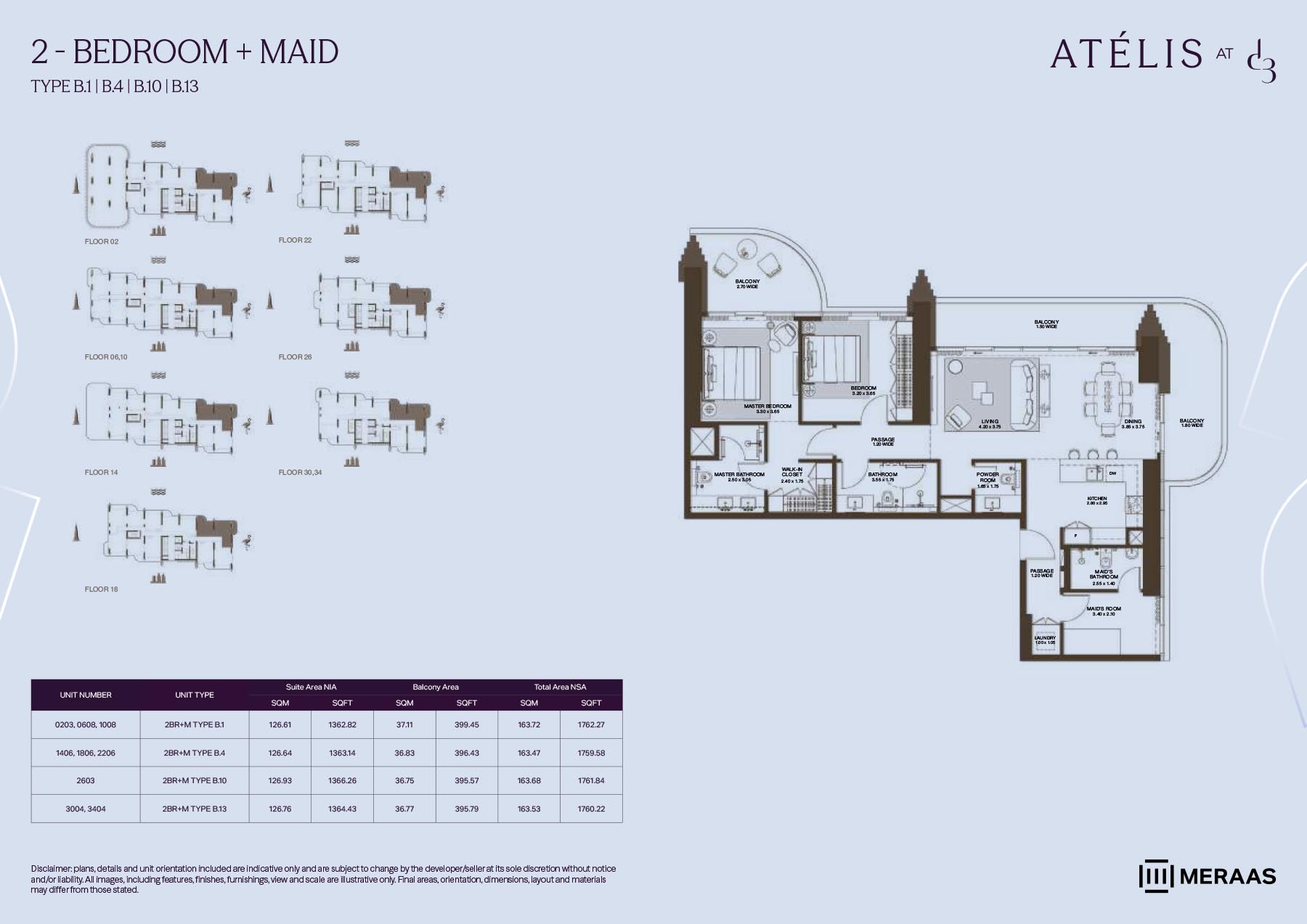 | Floor 02-34 | 2 Bedrooms + Maid | Type B1-B13 (Unit 0203-3404) | 1762.27 Sq Ft | Apartments |