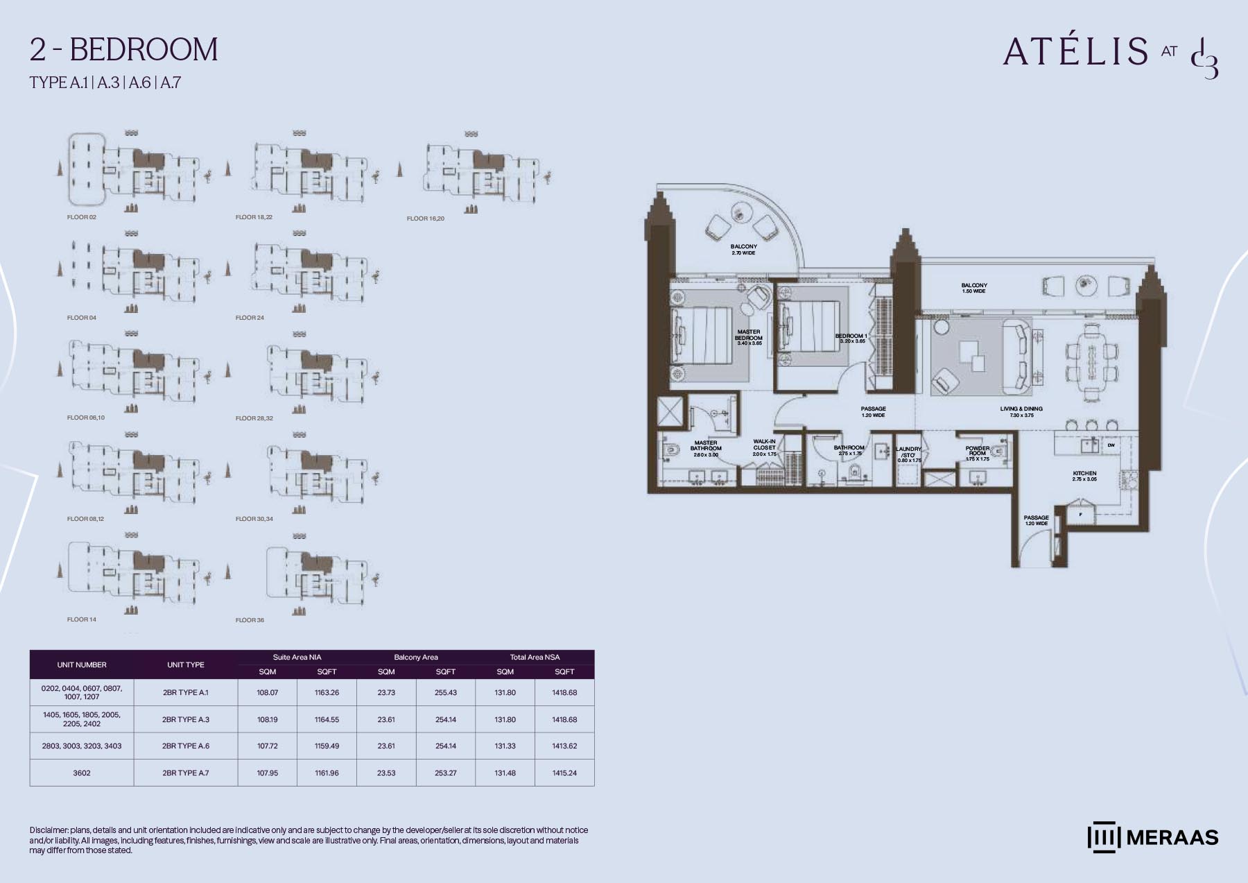 | Floor 02-36 | 2 Bedrooms | Type A1-A7 (Unit 0202-3602) | 1418.68 Sq Ft | Apartments |