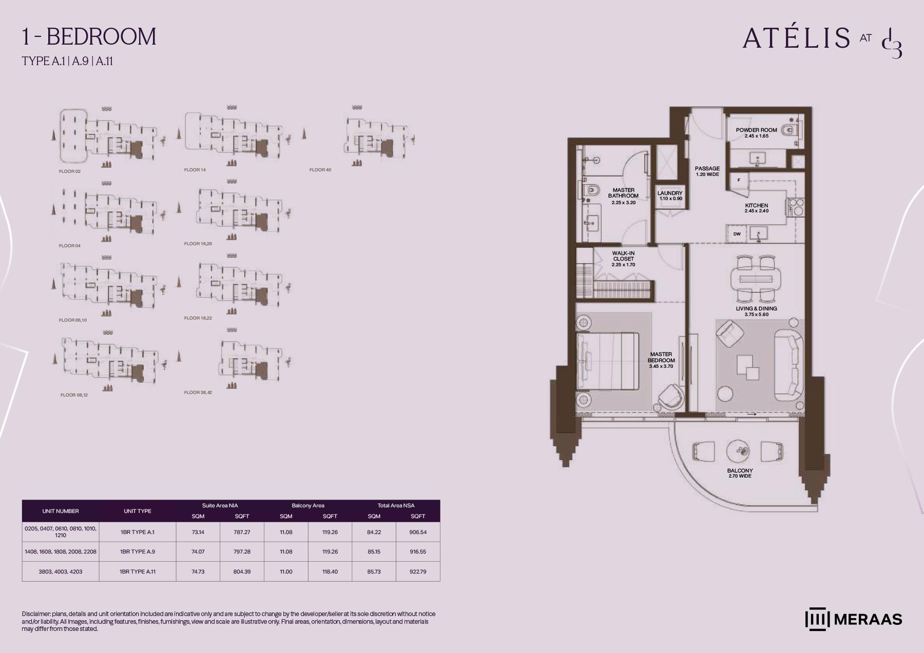 | Floor 02-42 | 1 Bedroom | Type A1-A11 (Unit 0205-4203) | 922.79 Sq Ft | Apartments |