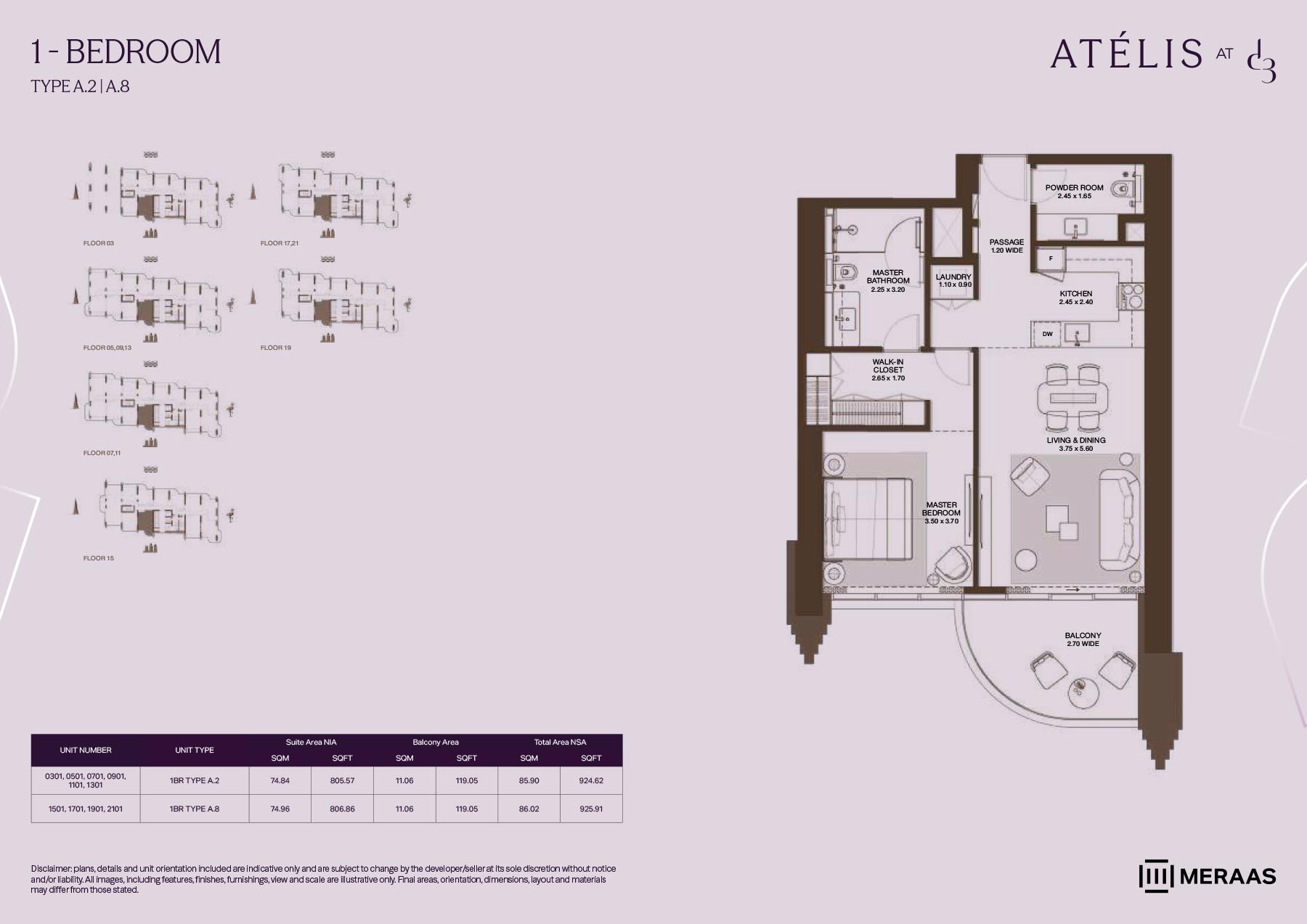 | Floor 03-21 | 1 Bedroom | Type A2-A8 (Unit 0301-2101) | 925.91 Sq Ft | Apartments |