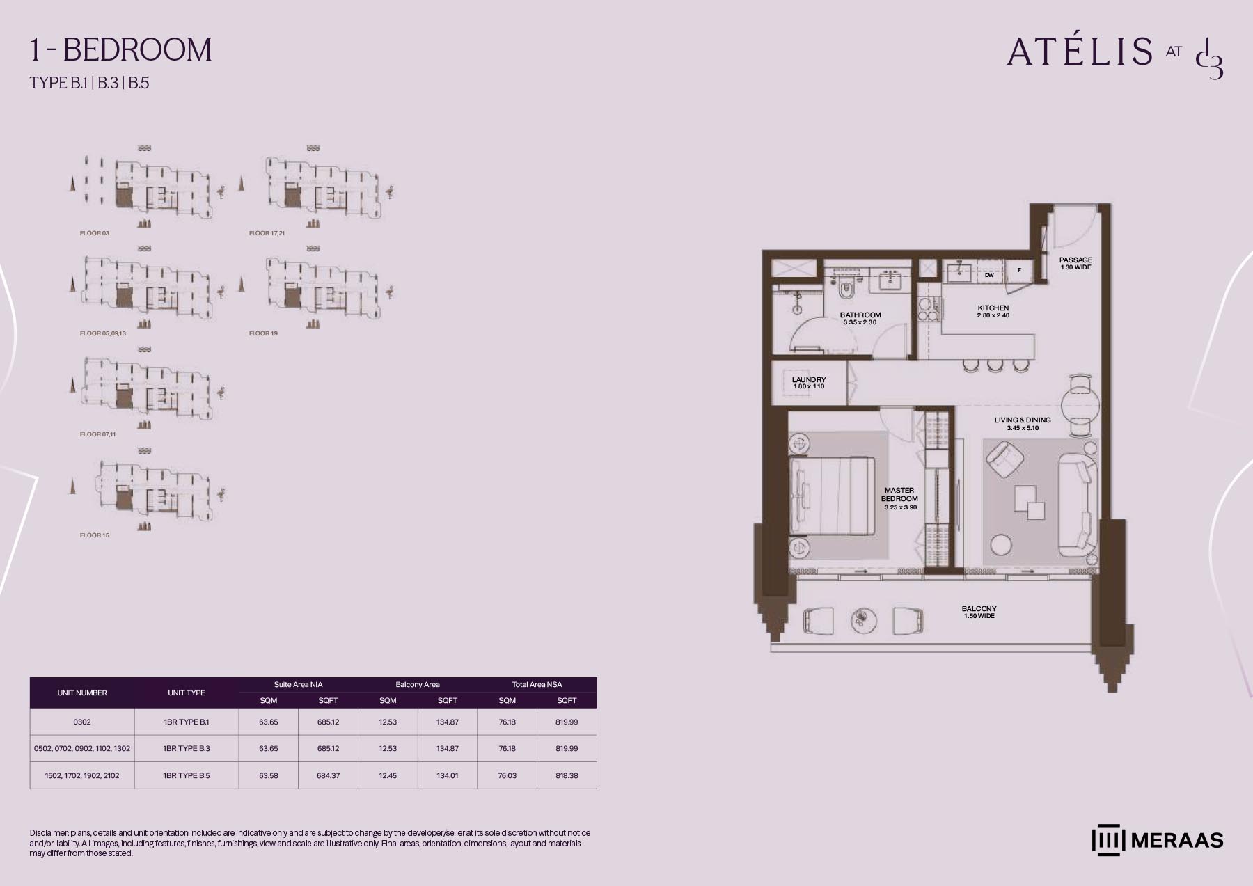 | Floor 03-21 | 1 Bedroom | Type B1-B5 (Unit 0502-2102) | 819.99 Sq Ft | Apartments |